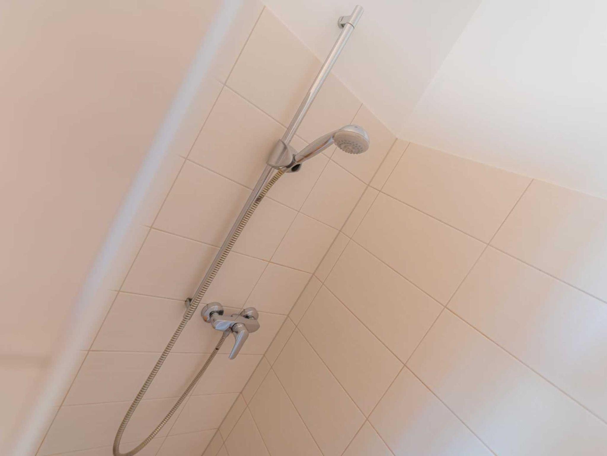 Modernes Badezimmer (Duschbad) mit bodengleicher Dusche, WC und Föhn.
