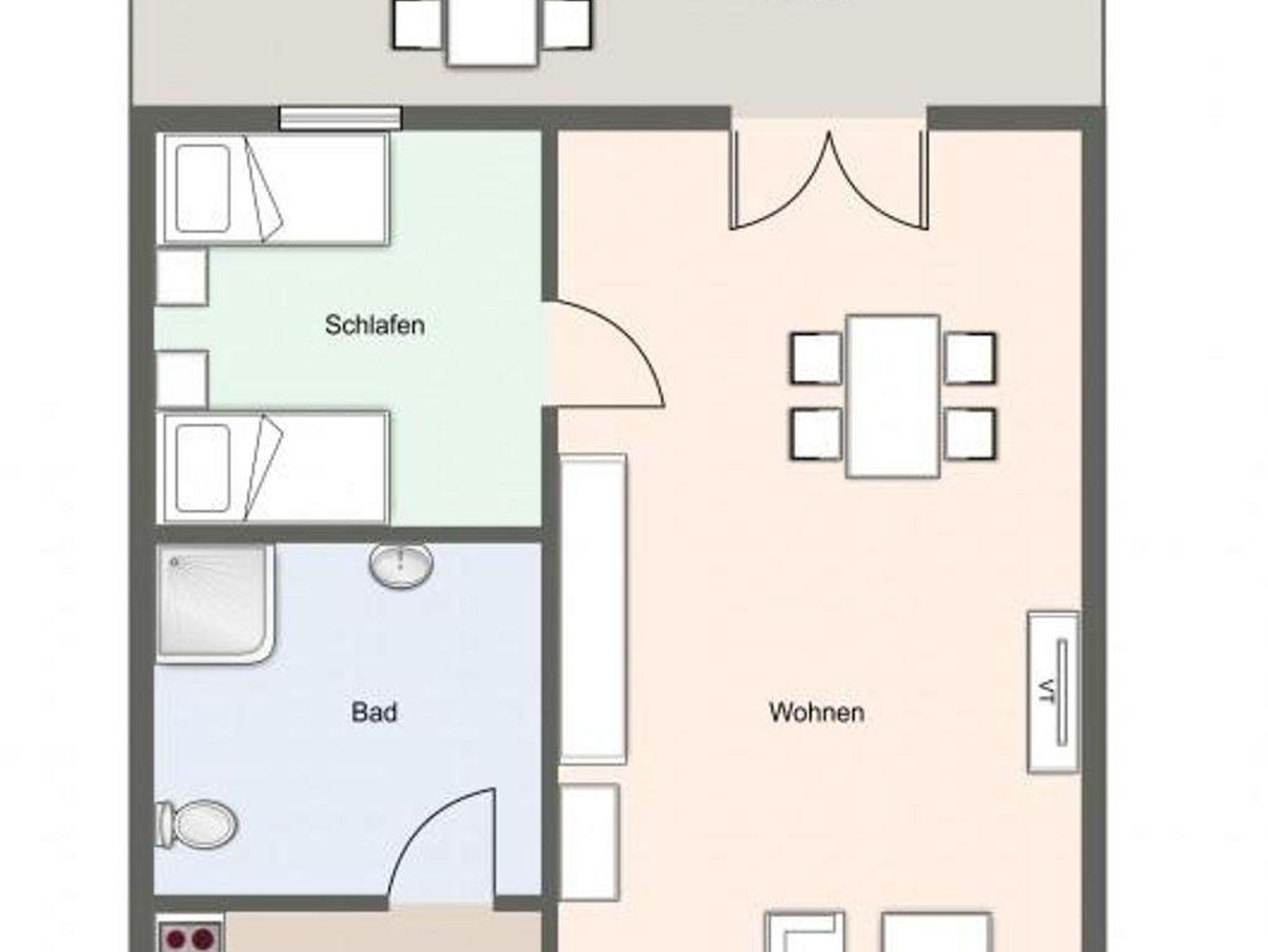 Die Ferienwohnung bietet auf 35 qm genügend Platz für 2 Personen. Das Wohnzimmer verfügt über eine Couch und Sessel des weiteren ist ein Couchtisch vorhanden. Auch ein Esstisch mit 4 Stühlen steht für Sie bereit. Die Küche ist ausgestattet mit einem Induktionsfeld, Geschirr, Kaffeemaschine, Kochtöpfe, Küchenzeile, Kühlschrank, Radio, Toaster, Minibackofen, Mikrowelle und einem Wasserkocher.