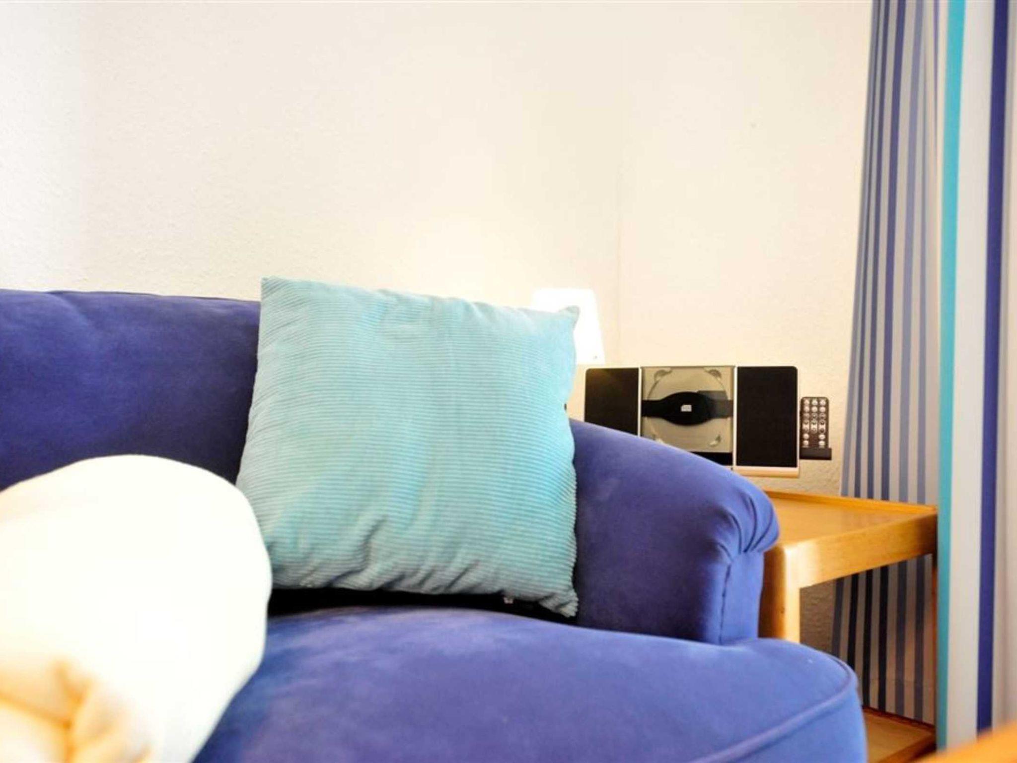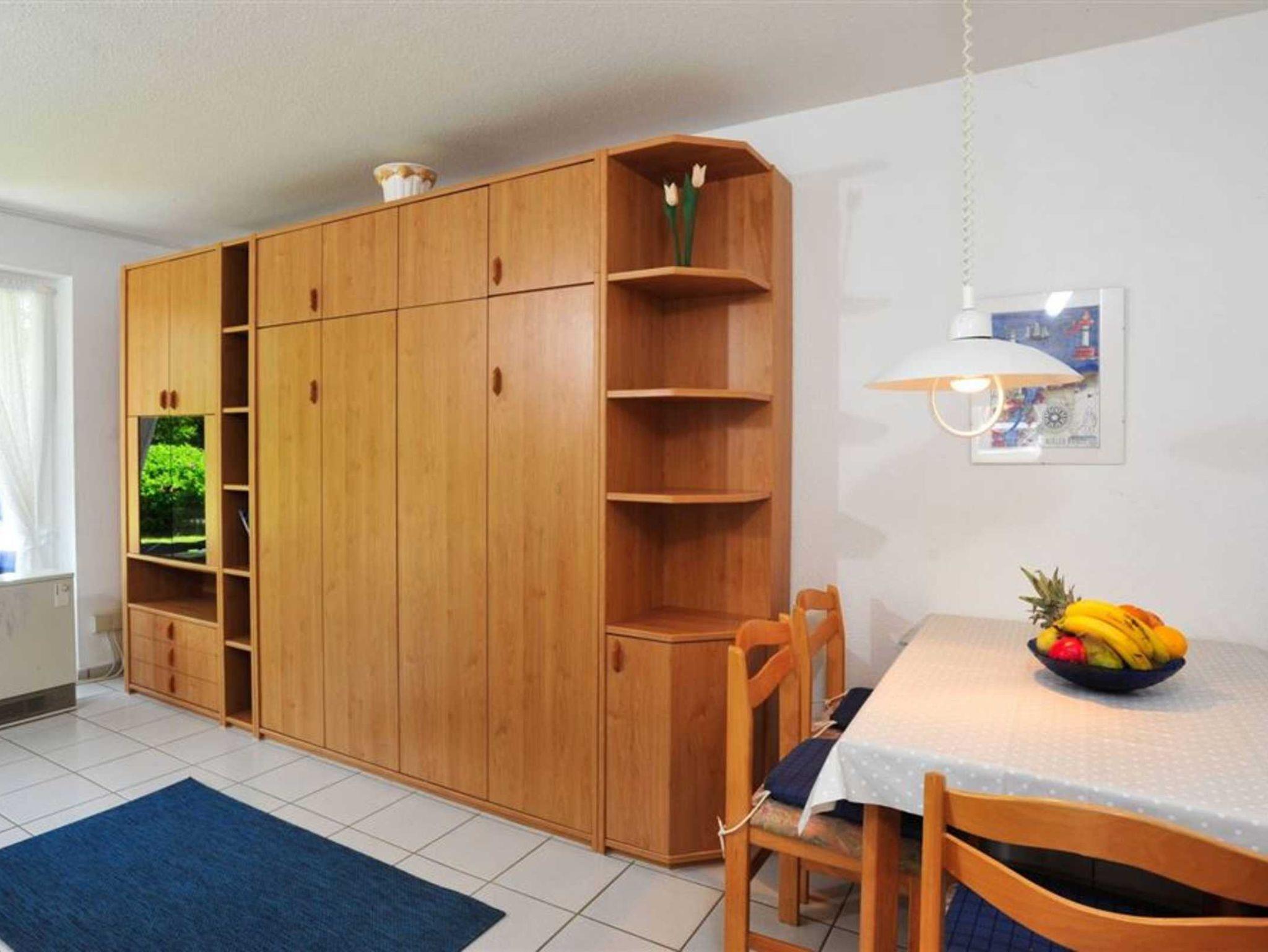 Wohnzimmer mit Sofa für 3 Personen, 2 Sesseln, Schrank-Doppelbett (2x 80x200cm), TV (Sat), Stereo-Kompaktanlage mit CD-Player und Esstisch mit 4 Stühlen. Direkter Zugang zur windgeschützten, möblierten Gartenterrasse nach Westen. Offene Küche mit Backofen, Mikrowelle und Kühlschrank mit Gefrierfach.
