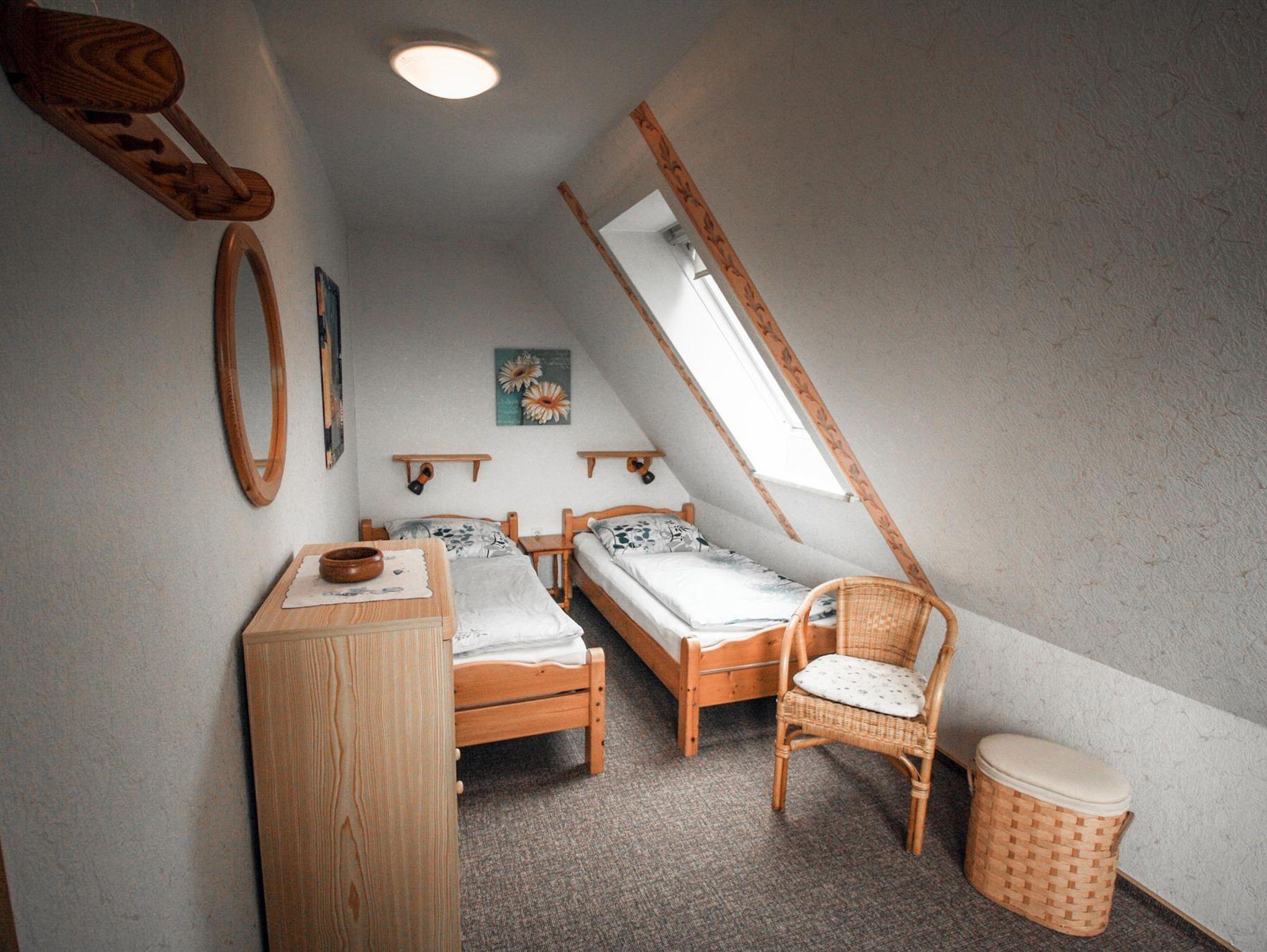 Schlafzimmer mit einem Einzelbett und ein weiteres Schlafzimmer mit zwei Einzelbetten
