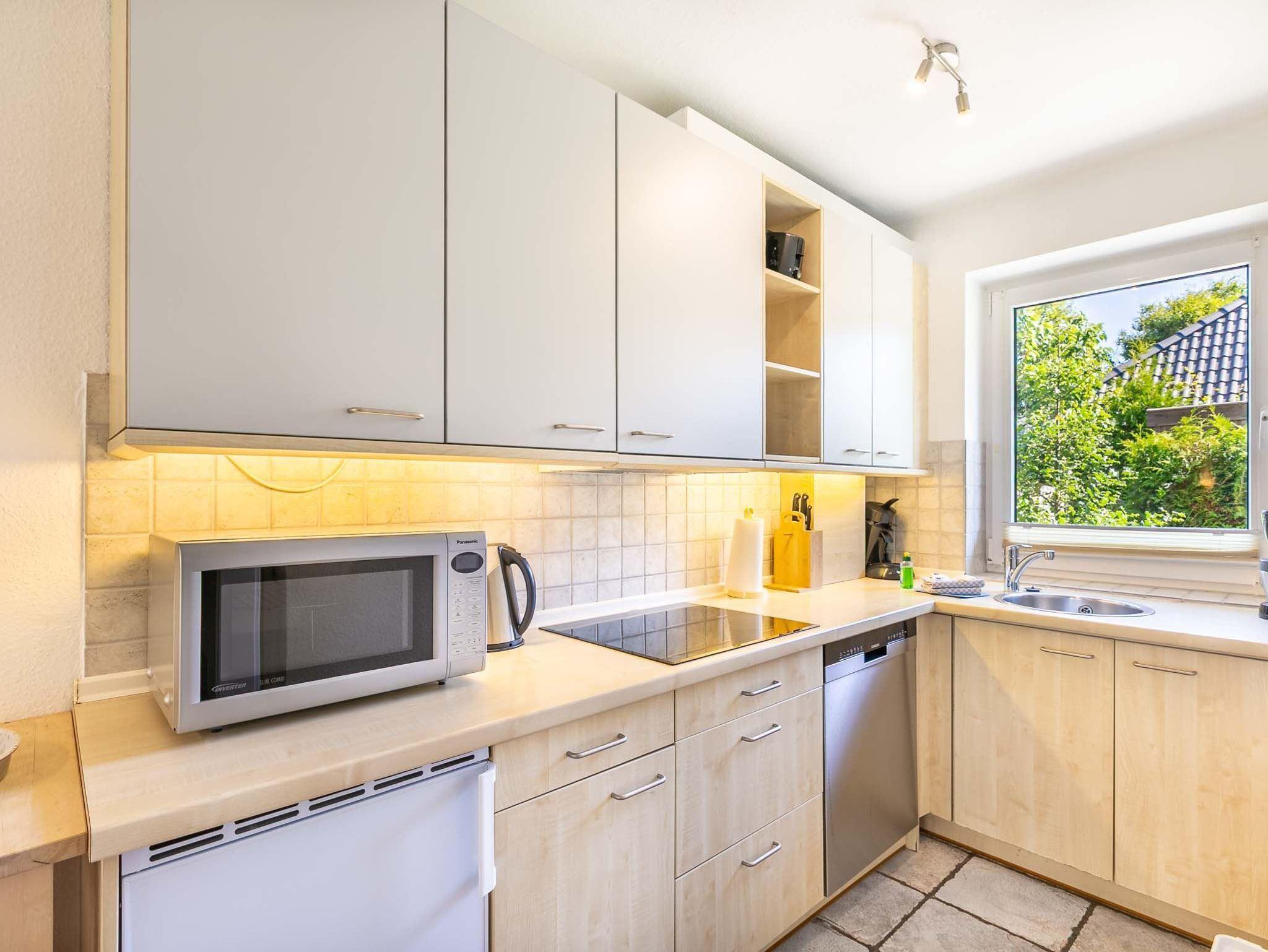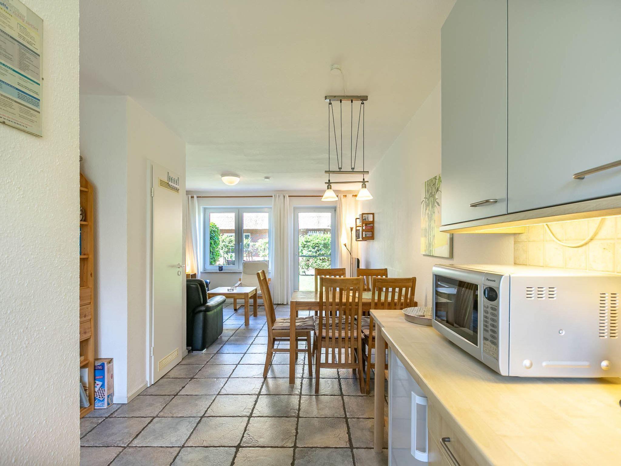 Wohnzimmer mit zwei Sofas, Sessel, TV (Sat), DVD-Player und Esstisch mit 5 Stühlen. Direkter Zugang zur windgeschützten, möblierten Gartenterrasse nach Süden. Offene Küche mit Mikrowelle mit Grill-Funktion, Geschirrspüler, Kühlschrank mit Gefrierfach znd Philips Senseo Kapsel-Kaffeemaschine.