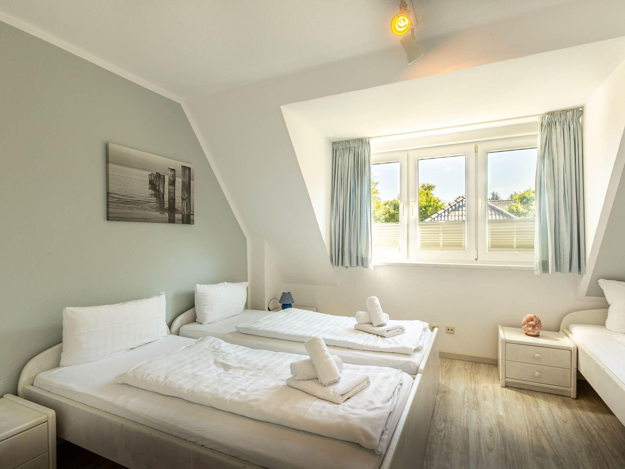 2. Schlafzimmer mit 3 Einzelbetten (je 90x190cm) und Kleiderschrank.