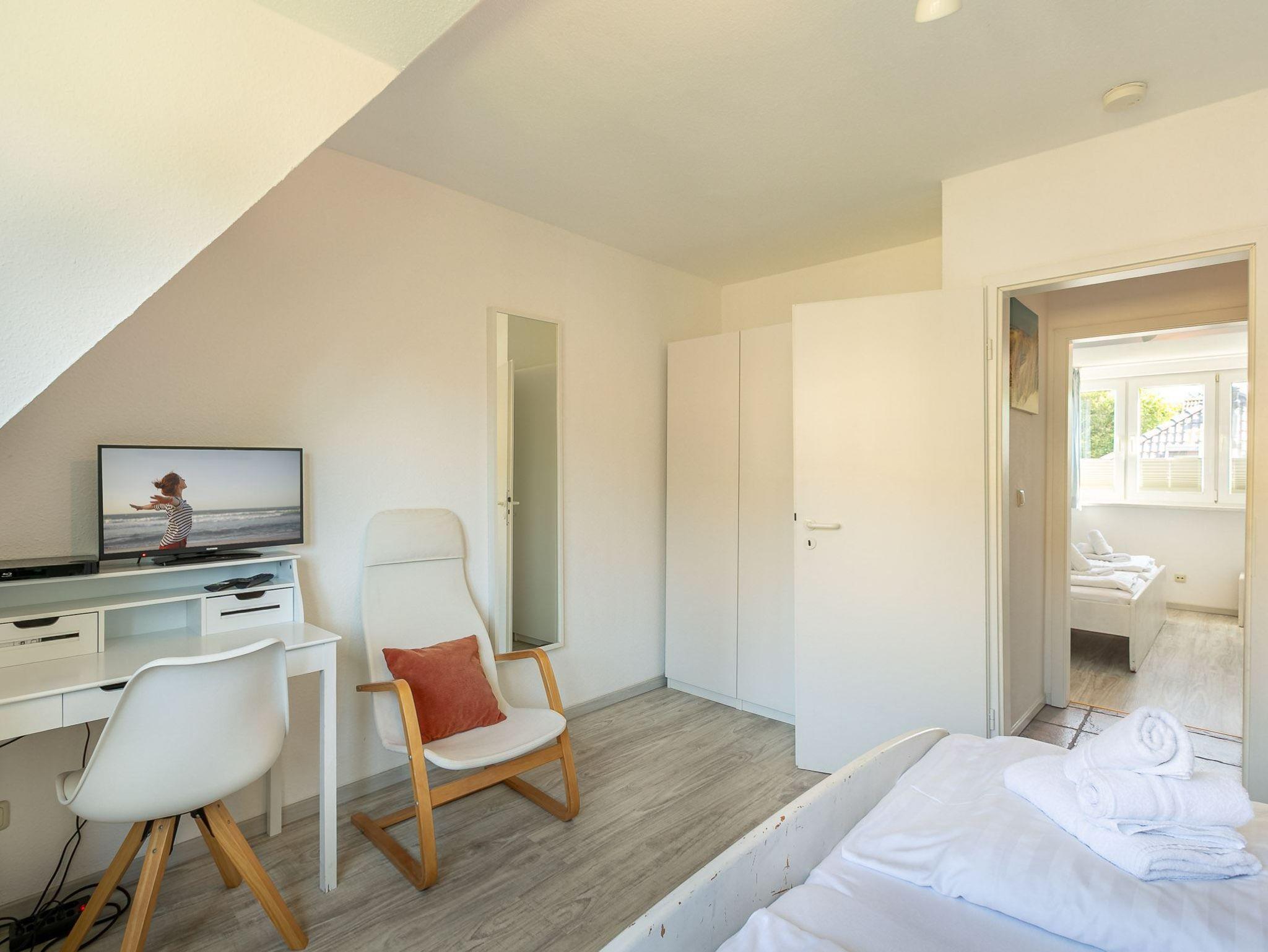 1. Schlafzimmer mit Doppelbett (2x 90x200cm), Kleiderschrank, Sessel, kleinem Schreibtisch mit Stuhl und SMART-TV (Sat) mit BluRay-Player.
