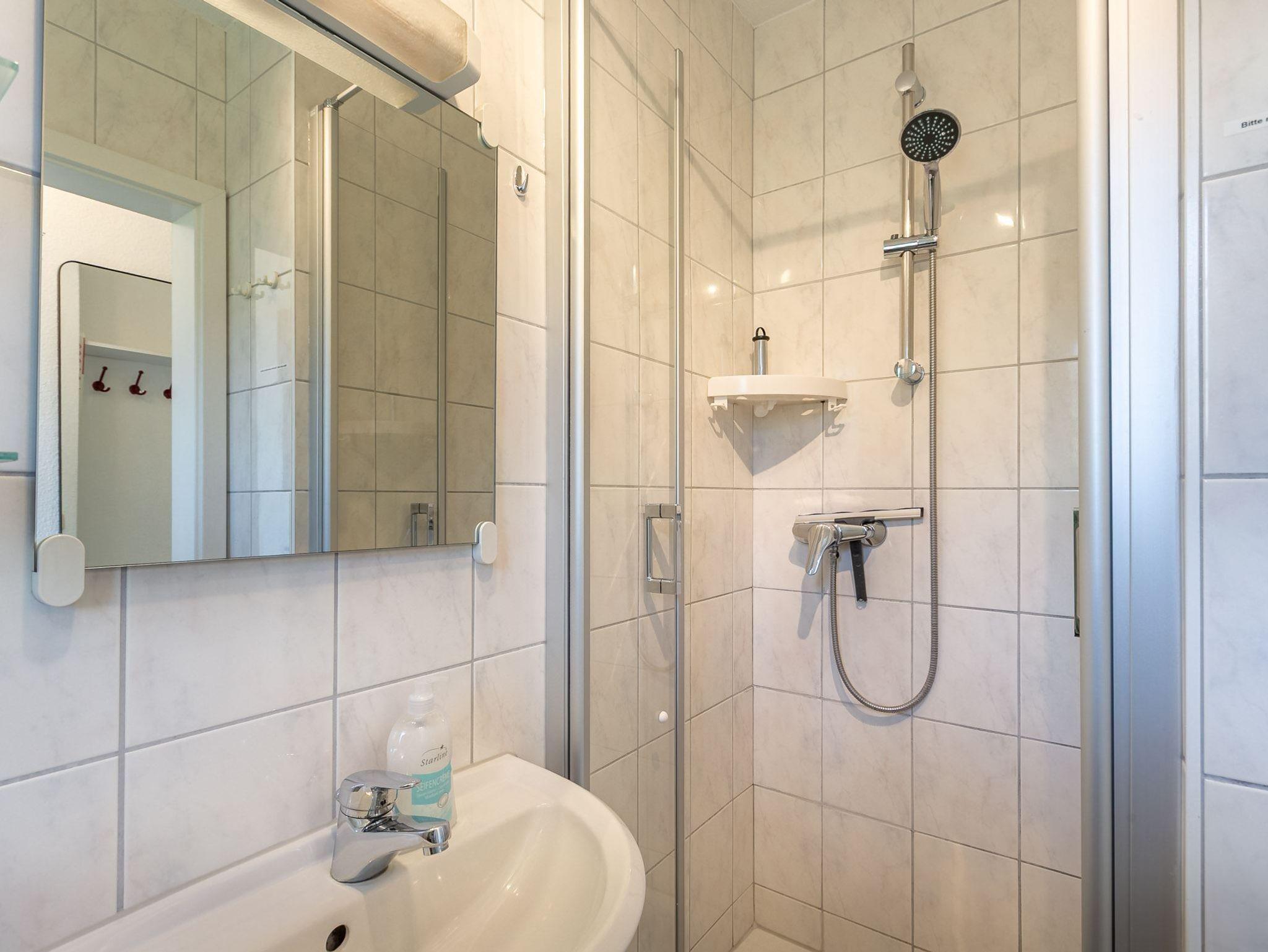 Badezimmer (Duschbad) mit Dusche, WC, Tageslicht und Föhn.