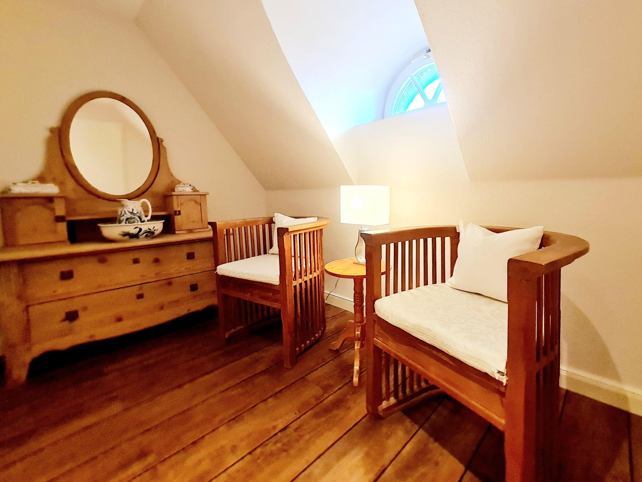 Das charmant ausgestattete Schlafzimmer mit Doppelbett, TV und begehbarem Kleiderschrank befindet sich im Obergeschoss und bietet sämtliche Annehmlichkeiten.