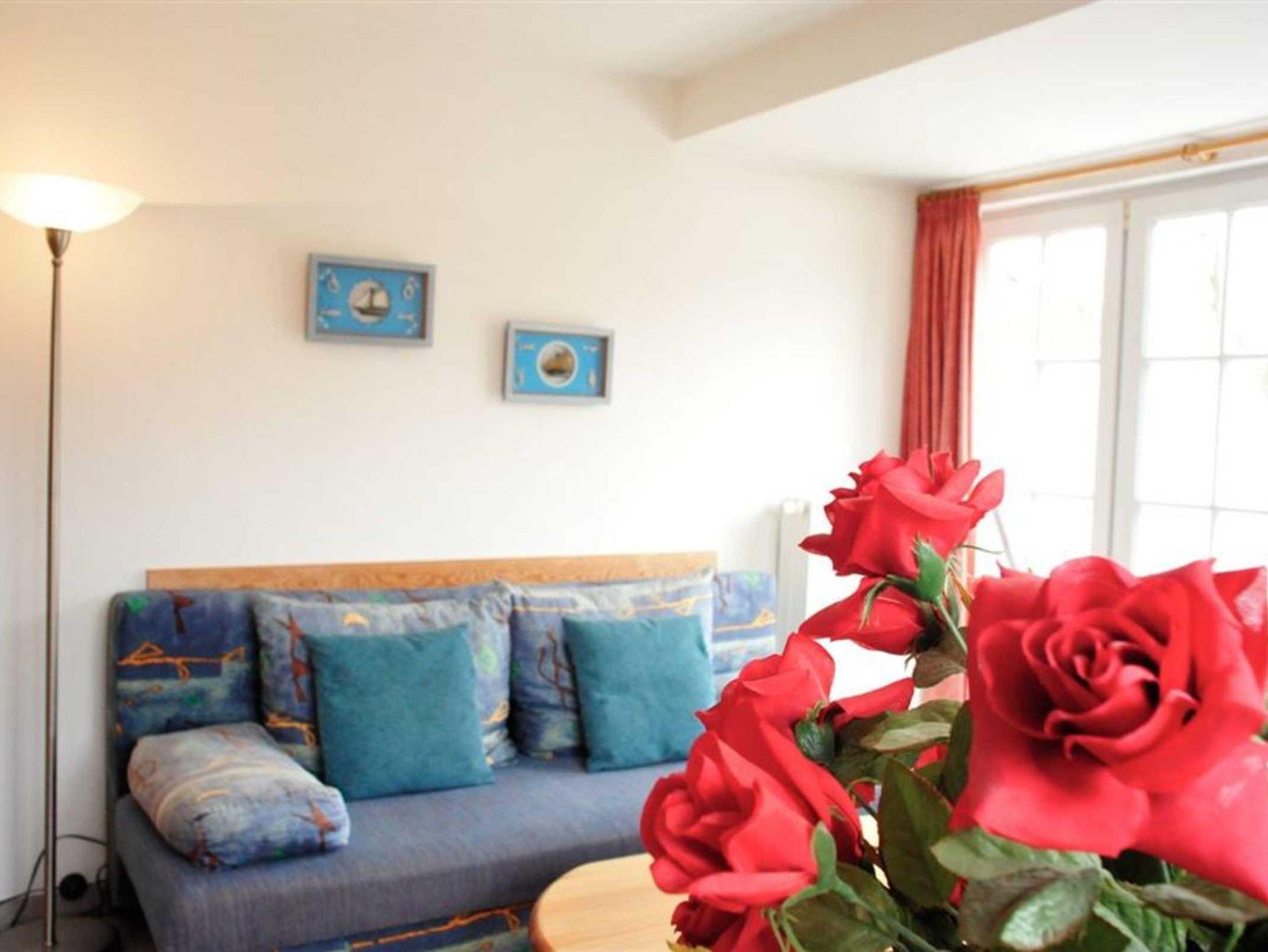 Wohnzimmer mit ausziehbarem Schlafsofa (160x200cm), TV (Kabel), Stereo-Kompaktanlage und Esstisch mit 4 Stühlen. Direkter Zugang zum möblierten Balkon nach Süden mit Waldblick. Offene Küche mit Backofen, Mikrowelle, Geschirrspüler, Kühlschrank mit Gefrierfach und Radio.
