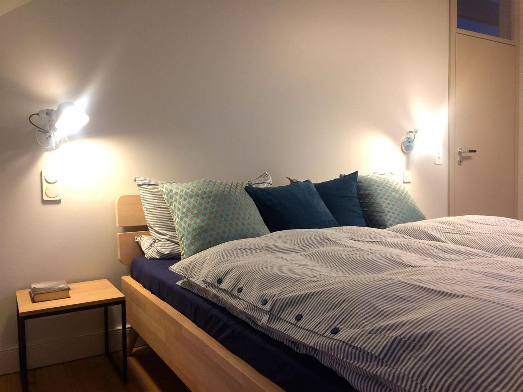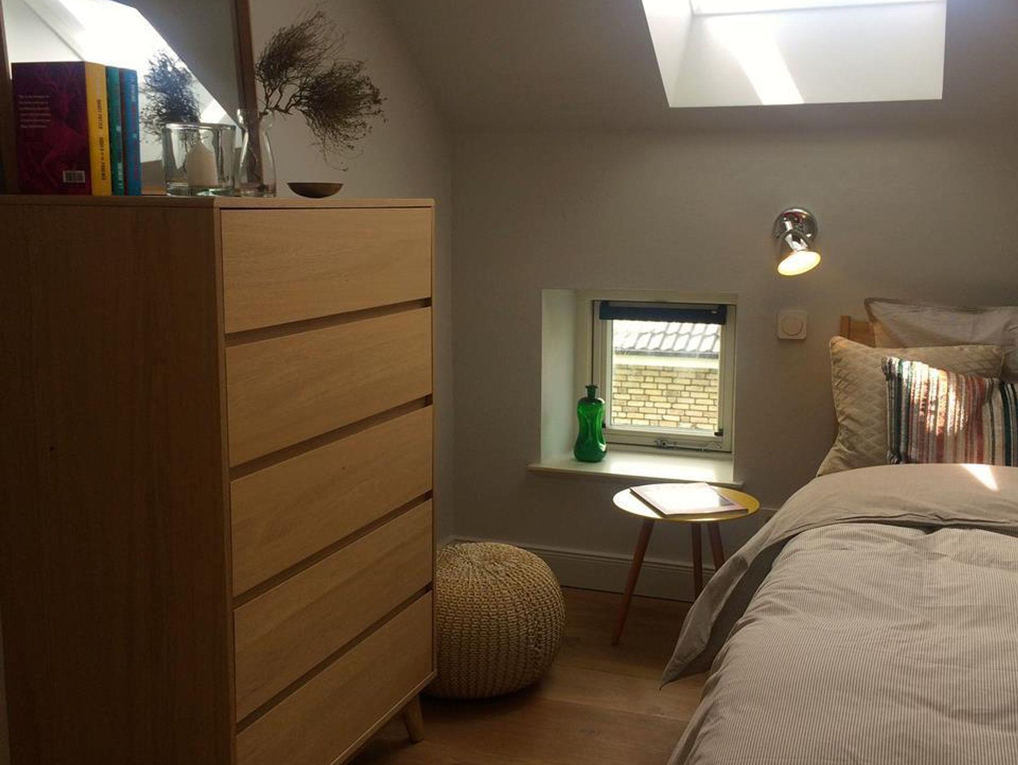 Über eine moderne Beton-Holz-Treppe gelangt man in das mit Holzdielen ausgelegte Obergeschoss. Hier befinden sich drei hochwertig eingerichtete separate Schlafzimmer. Zwei der Schlafzimmer sind mit einem 1,80x2,00m Bett, eines mit einem 1,60x2,00m Bett. Darüber hinaus befindet sich im Obergeschoss ein Vollbad mit großer begehbarer Dusche mit Regenbrause sowie ein Allzweckraum ausgestattet mit Waschmaschine und Trockner.Das gesamte Haus kann über Fußbodenheizung beheizt werden. Im Außenbereich stehen zwei PKW-Stellplätze und ein große Rasenfläche zur Verfügung.