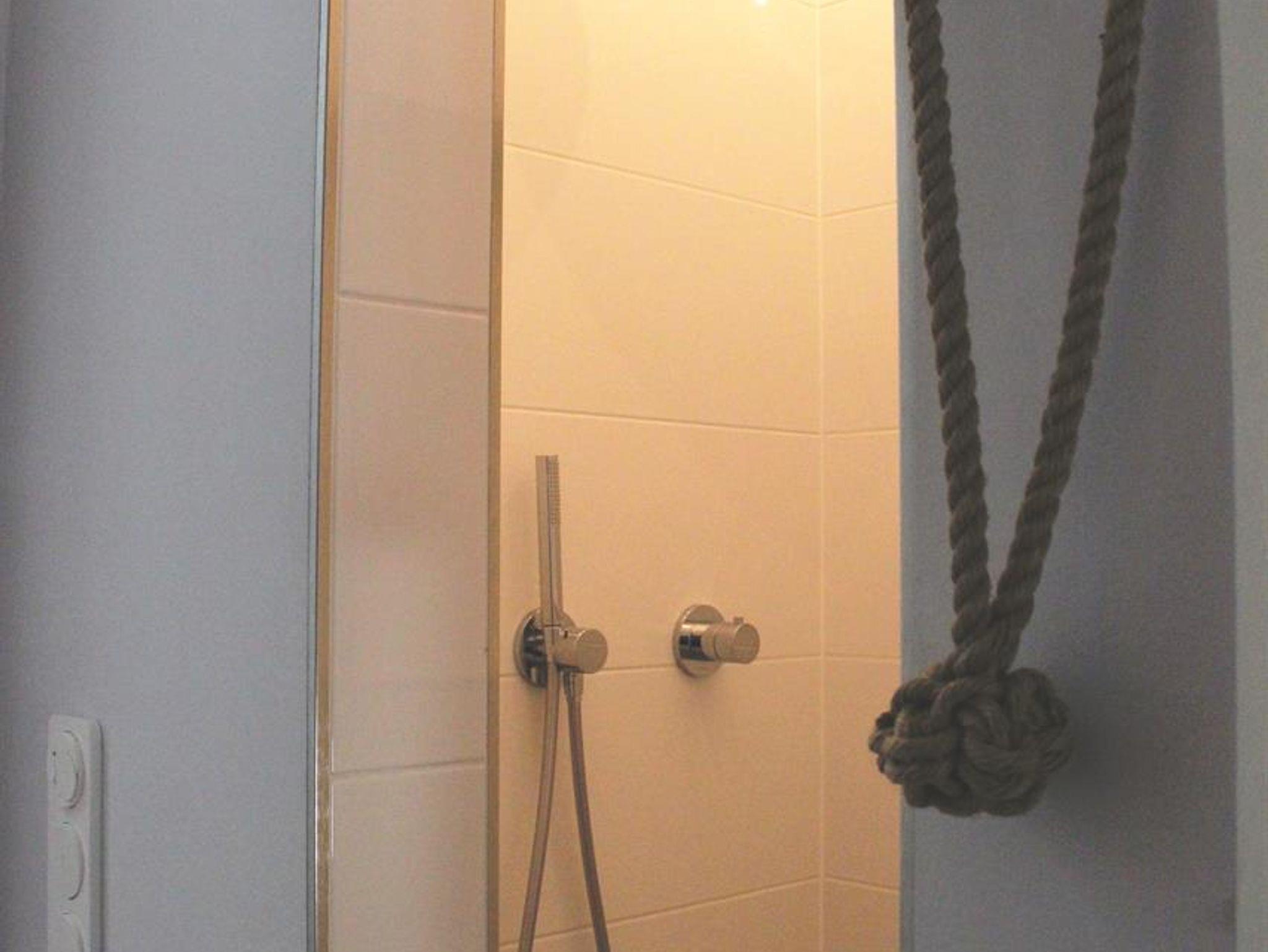 Im Obergeschoß des Hauses ist das Badezimmer ausgestattet mit: 2 Waschtischen, Regendusche, Kosmetikspiegel, Haarfön, Waschmaschine, Trockner und WC. Ein Bügeleisen, Wäscheständer und Bügelbrett ist vorhanden.