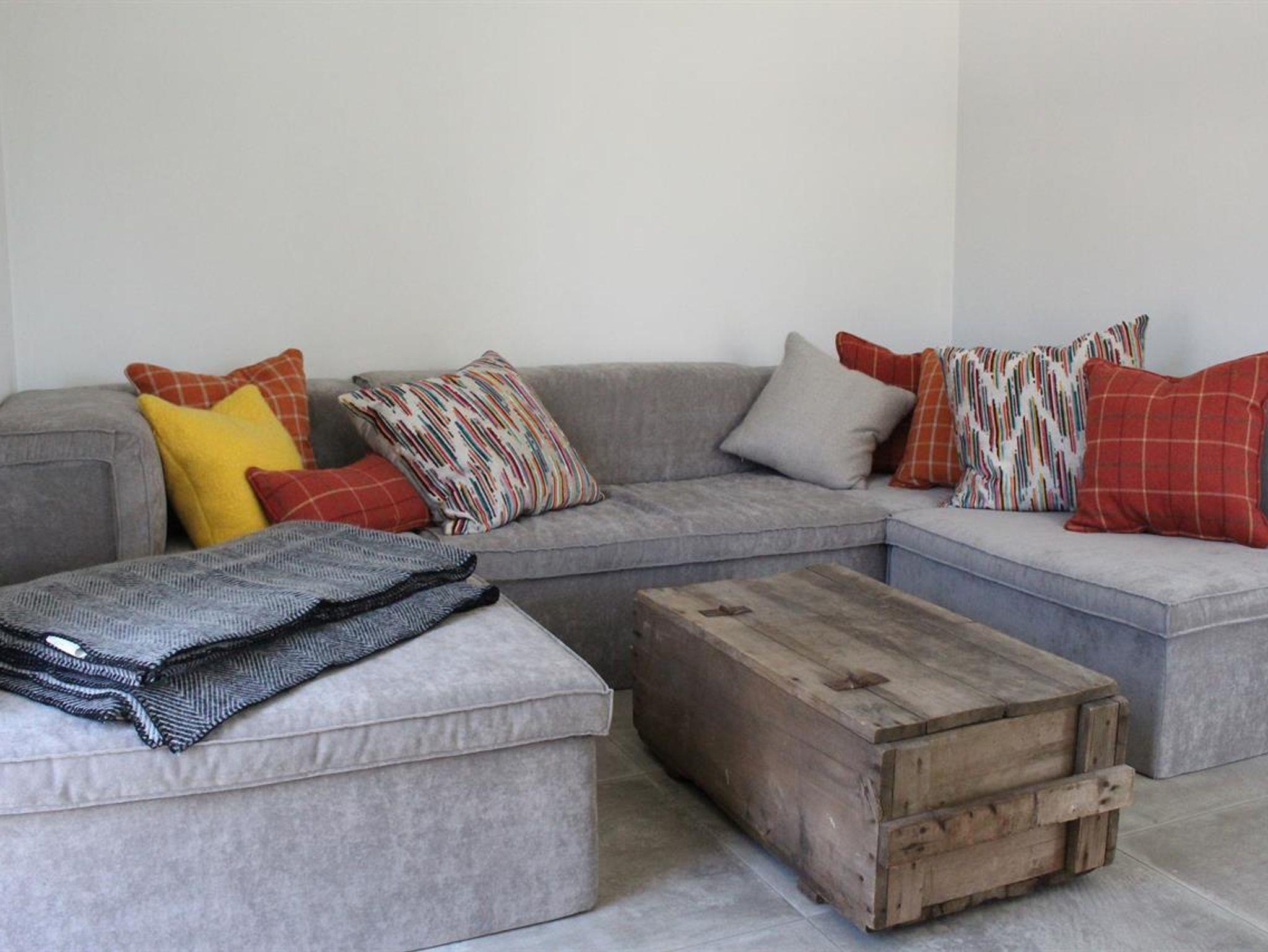 Im Erdgeschoss laden eine offene Wohnküche -ausgestattet mit hochwertigen Elektrogeräten (inkl. eingebautem Weinkühler) - zum Kochen, eine Liegelandschaft mit Kamin und TV für gemütliche Abende zu Hause, sowie eine sonnige Aussenterrasse mit großem Tisch und Sonnenliegen zum Enspannen ein.