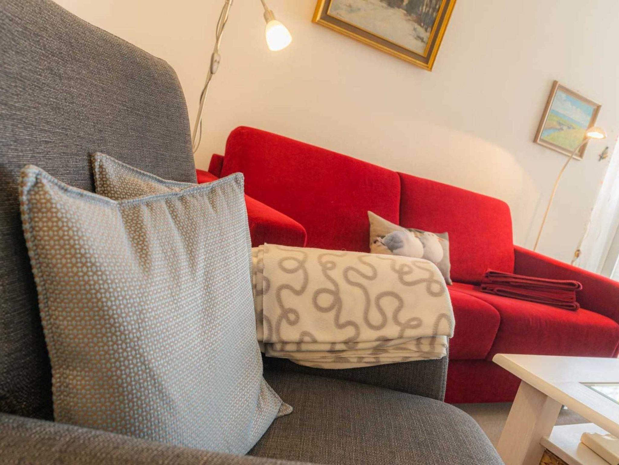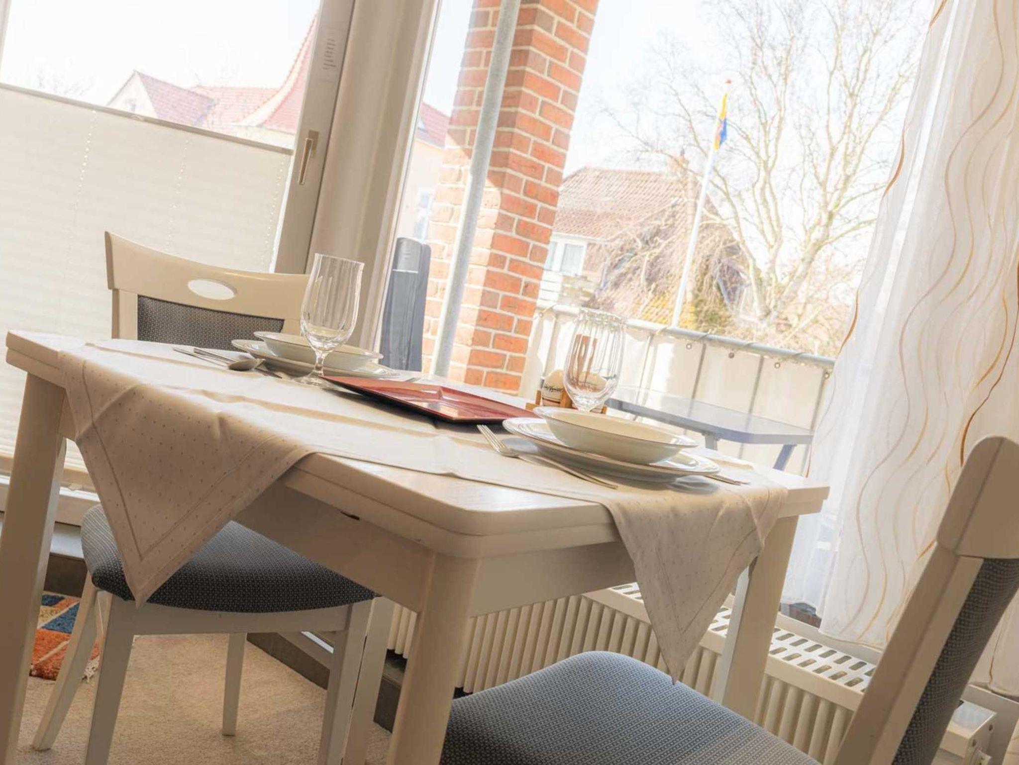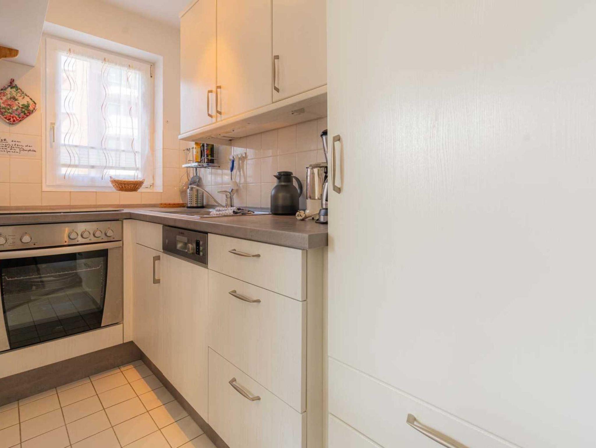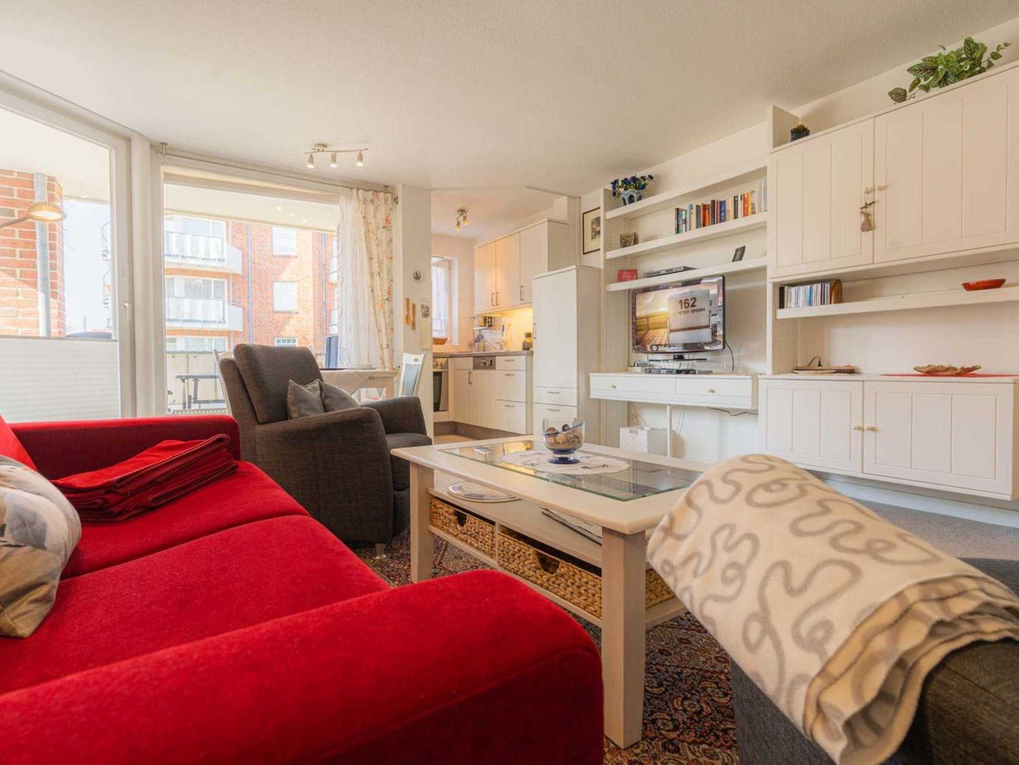 Wohnzimmer mit ausklappbarem (Schlaf-) Sofa (140x190cm), 2 Sesseln, Esstisch für 2-4 Personen, TV (Kabel) mit DVD-Player und Telefon. Direkter Zugang zum möblierten Eck-Balkon nach Westen und Norden. Offene Küche mit Backofen, Mikrowelle, Geschirrspüler und Kühlschrank mit Gefrierfach.