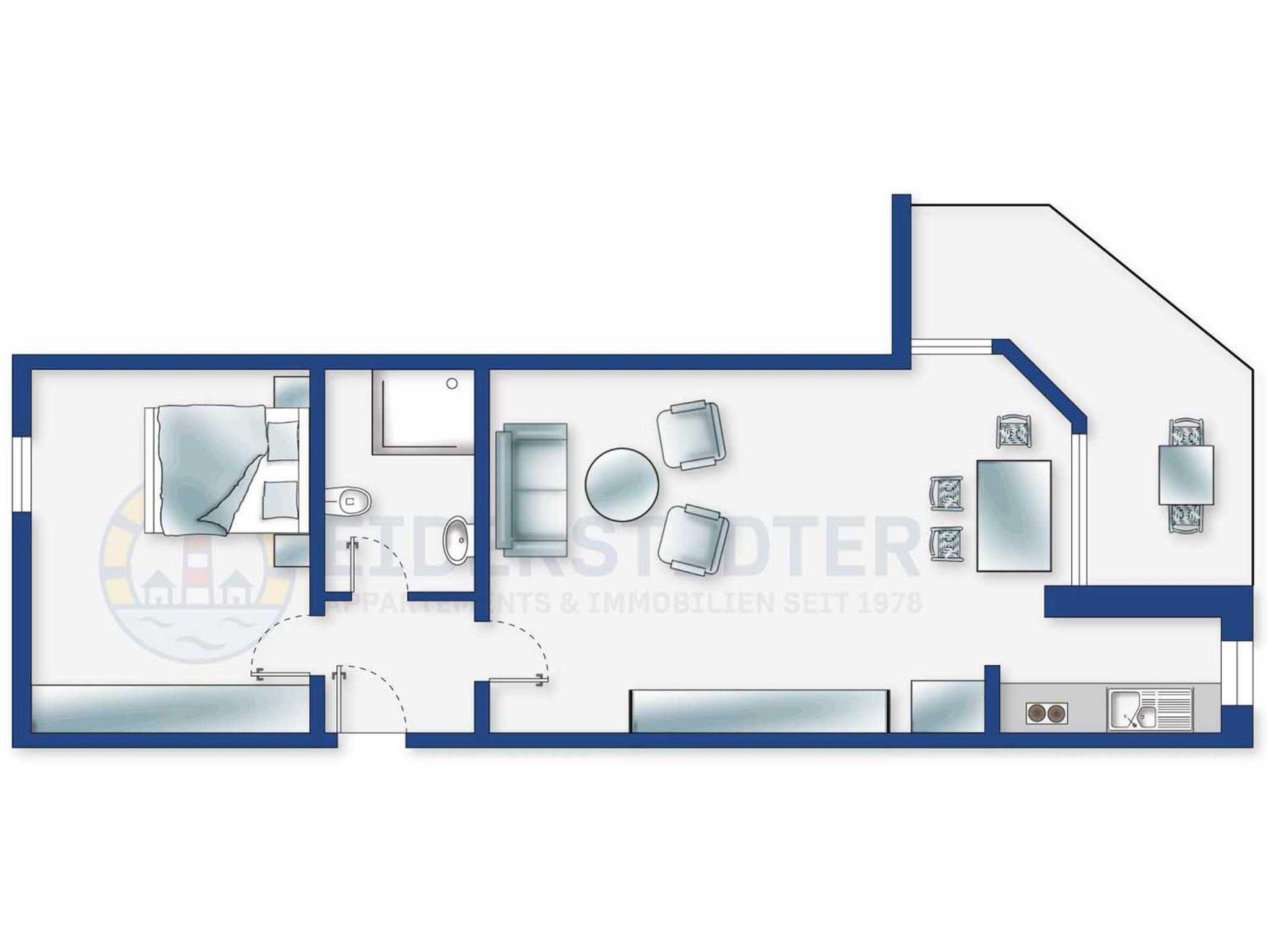 Strandnahe 2-Zimmer-Ferienwohnung mit ca. 45 qm auf 1 Ebene (1. OG) für bis 4 Personen. Zentrale Lage im Ortsteil Bad in St. Peter-Ording. Zur Promenade, dem Strand, der Dünentherme und allen Restaurants und Geschäften des Kurzentrums sind es nur wenige Gehminuten. Mit großem Balkon.