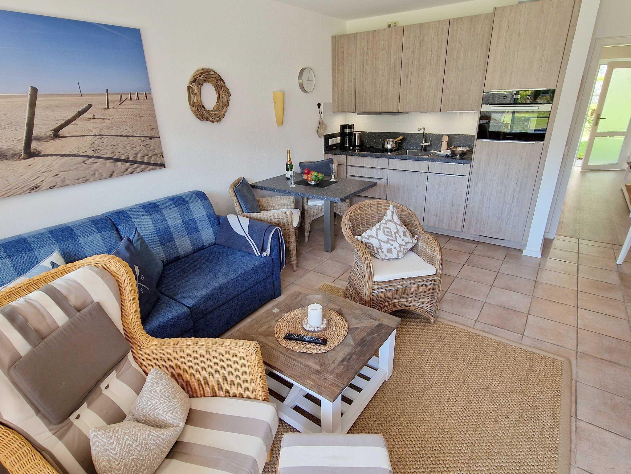 Es erwartet Sie eine komplett renovierte, komfortable 42qm große 2-Zimmer Ferienwohnung in hellen strandtypischen Naturfarben mit liebevoll ausgesuchter Ausstattung. Eine hochwertige Küchenzeile mit Geschirrspüler, ein modernes Bad ( 2026 Sanierung ) und ein gemütliches Schlafzimmer lasssen keine Urlaubswünsche offen. Auf der überdachten Terrasse befindet sich u.a. ein toller Strandkorb, in dem Sie mit Blick auf den Deich die Seele baumeln lassen können.