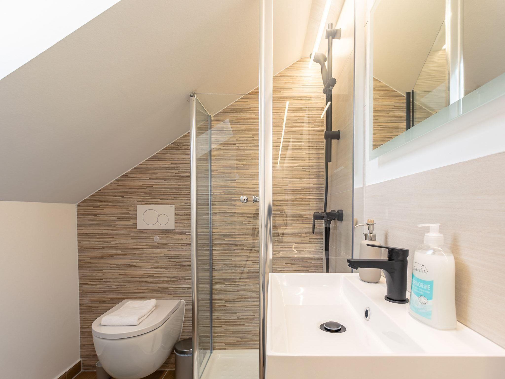 Badezimmer (Duschbad) mit Dusche, WC, Handtuchwärmer, Tageslicht und Föhn.