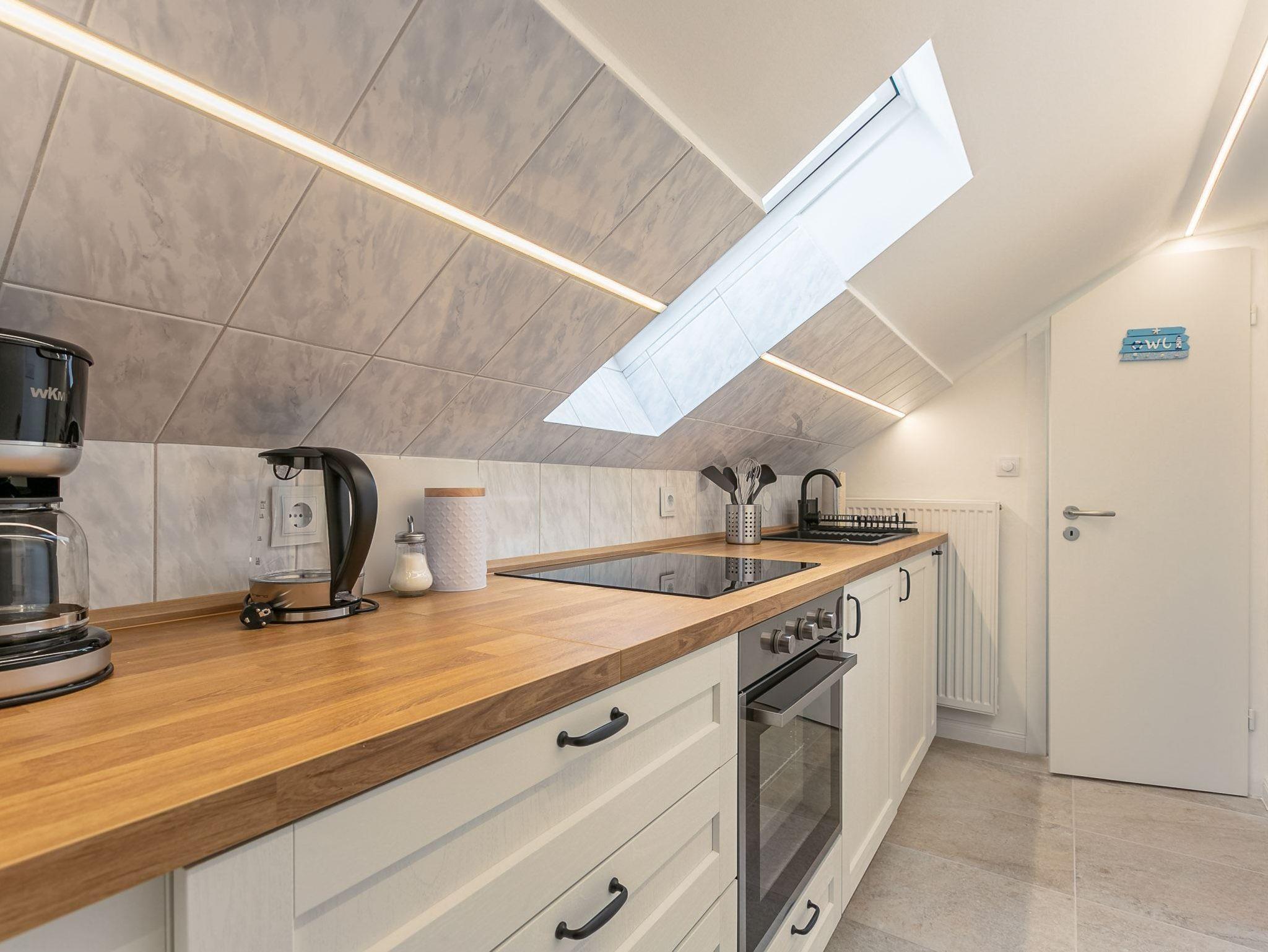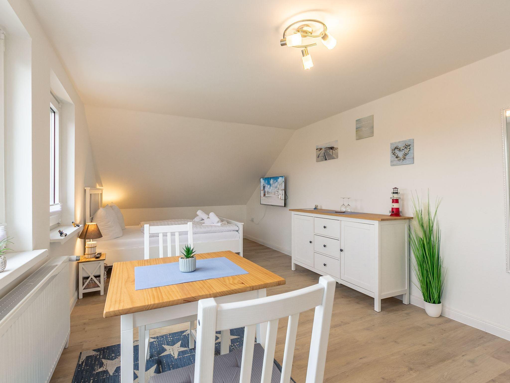 Wohn- und Schlafzimmer mit franz. Doppelbett (140x200cm), Kleiderkommode, Sofa, kleinem Esstisch mit 2 Stühlen und SMART-TV (Waipu). Separate Küche mit Herd mit 4 Induktionsfeldern und Kühlschrank mit Gefrierfach.