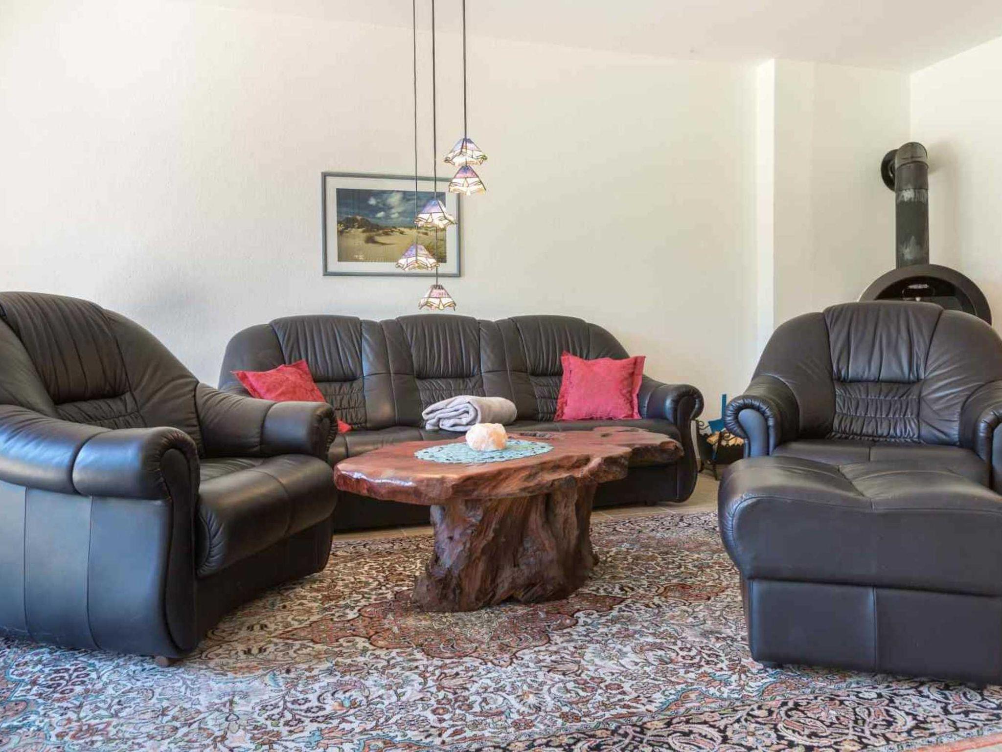 Wohnzimmer mit Sofa für 3 Personen, zwei Sesseln, gemütlichem Kaminofen, großem TV (Kabel), Stereo-Kompaktanlage mit CD-Player und Esstisch für 4 Personen. Halboffene Küche mit Backofen-Mikrowellen-Kombigerät, Geschirrspüler und Kühlschrank mit Gefrierfach. Direkter Zugang zur möblierten Gartenterrasse nach Süden mit Strandkorb.