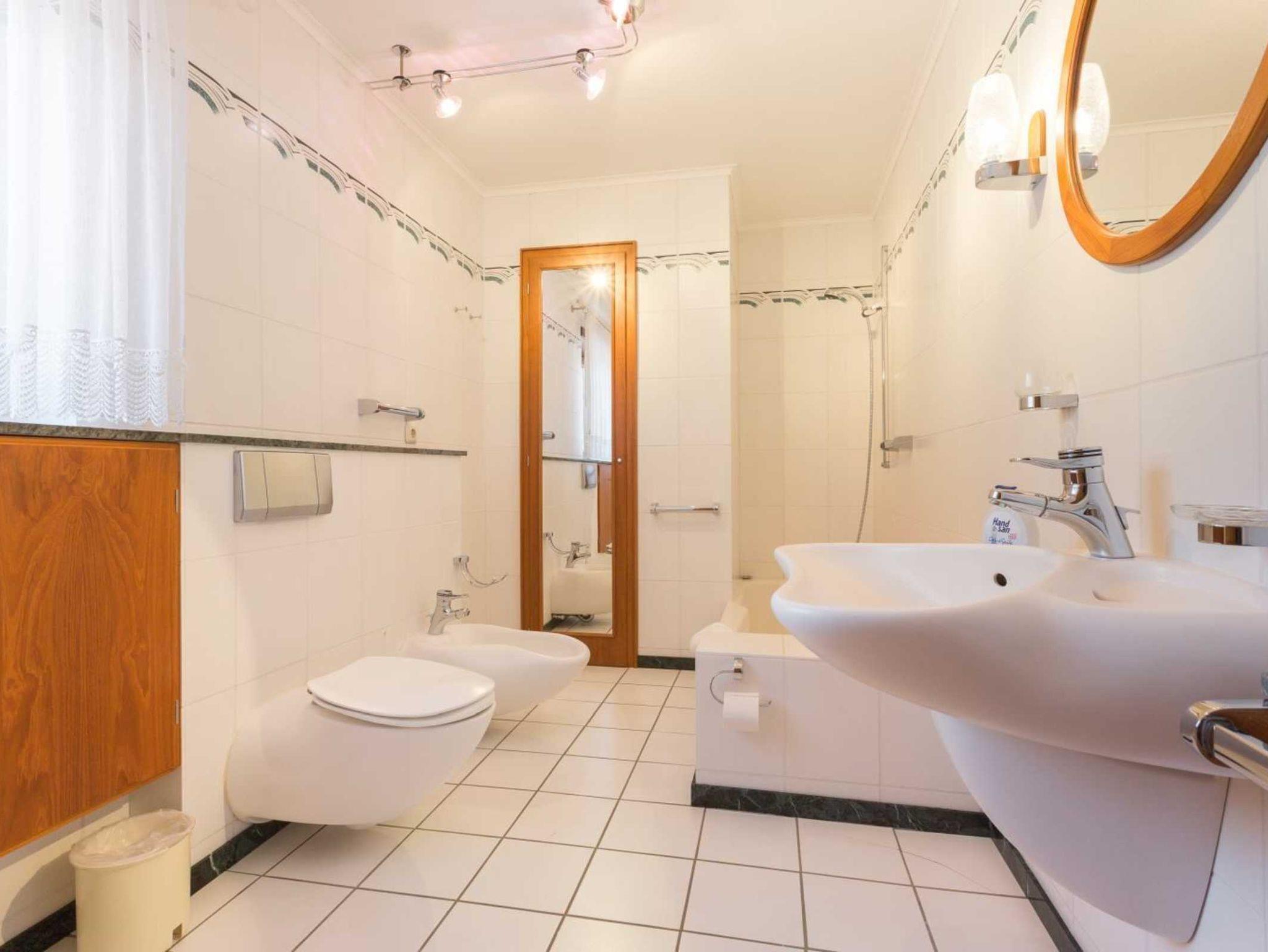 Badezimmer (Wannenbad) mit Badewanne mit Dusch-Handstück, WC, Bidet und Tageslicht.
