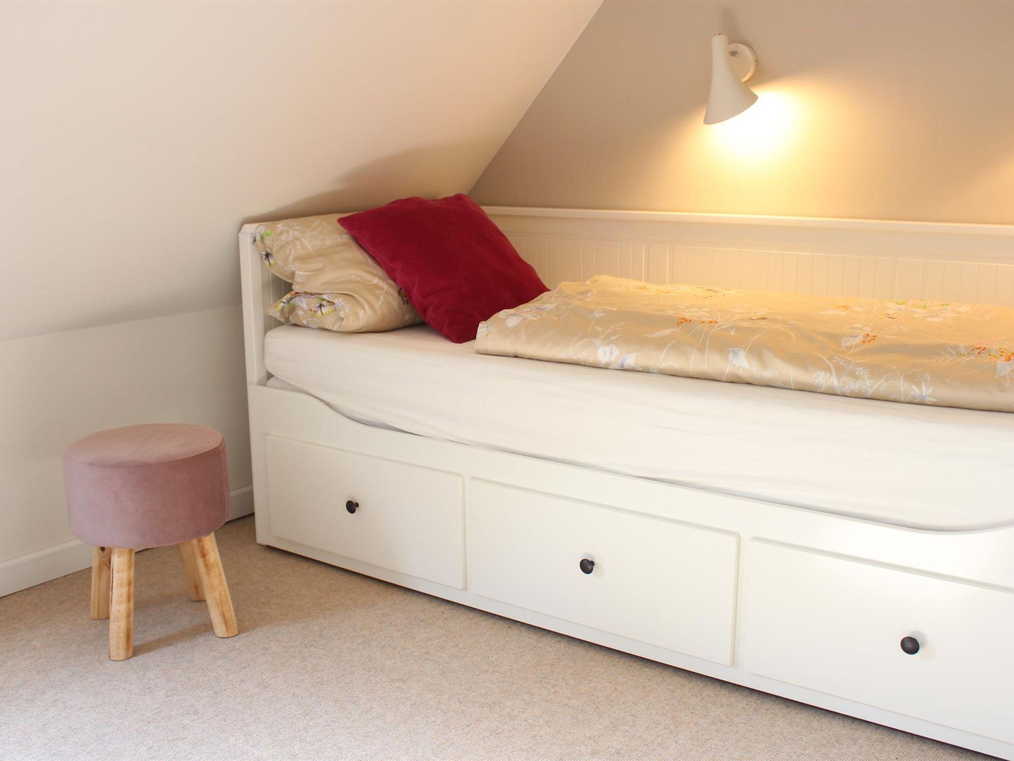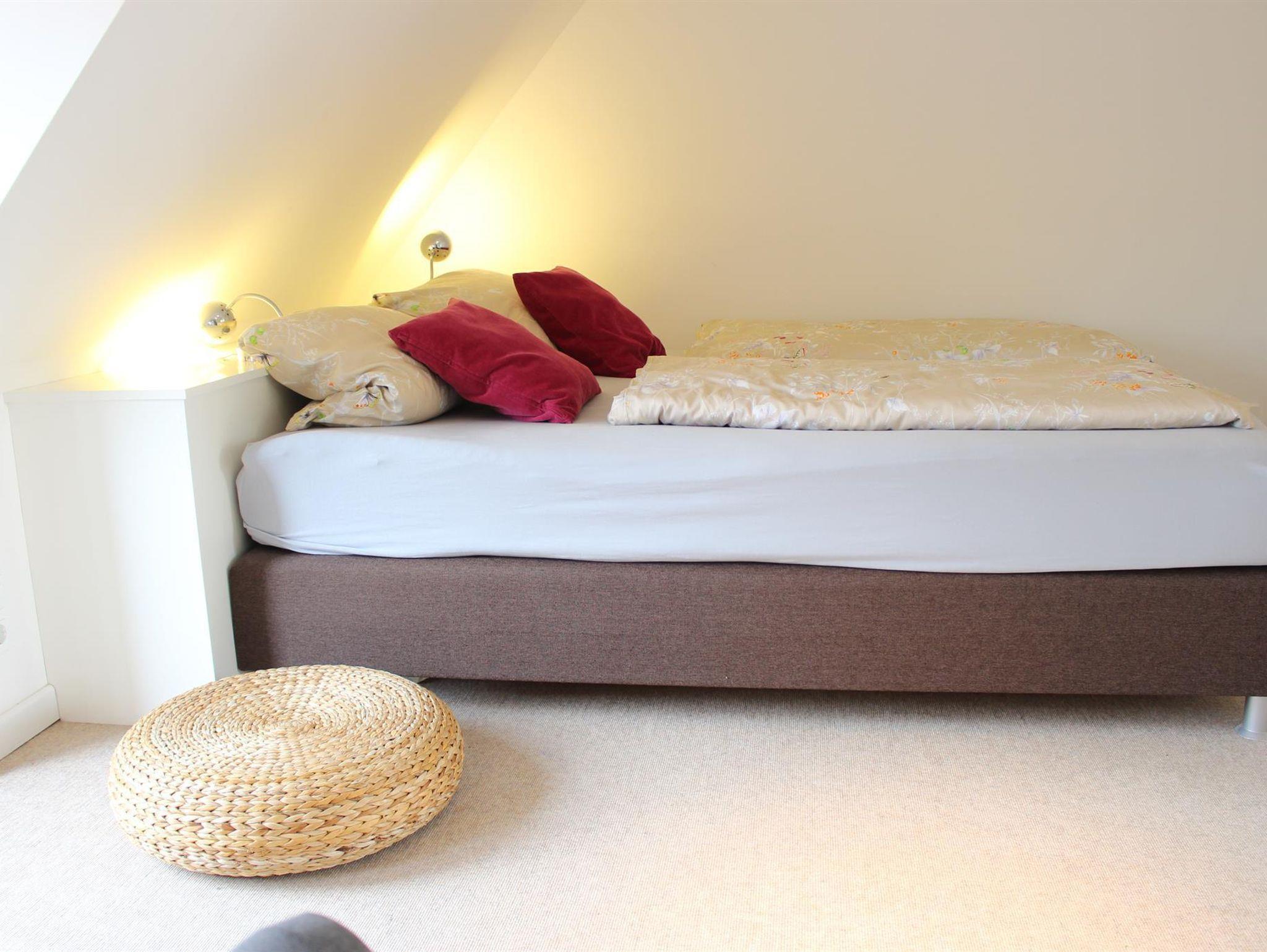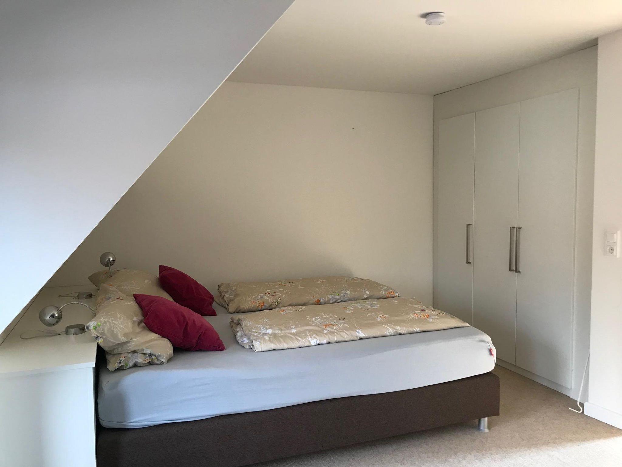 Im 1. Stock trennt das Badezimmer die beiden Schlafzimmer. Das grosszügige Elternschlafzimmer hat einen Balkon, ein Boxspringbett 180x210cm und verfügt über eine bequeme Leseecke mit Ohrensessel und Schreibtisch. Das Kinderschlafzimmer ist mit einem Einzelbett in der Niesche sowie einem ausziehbaren Hemnesbett (80/160x200cm) ausgestattet.