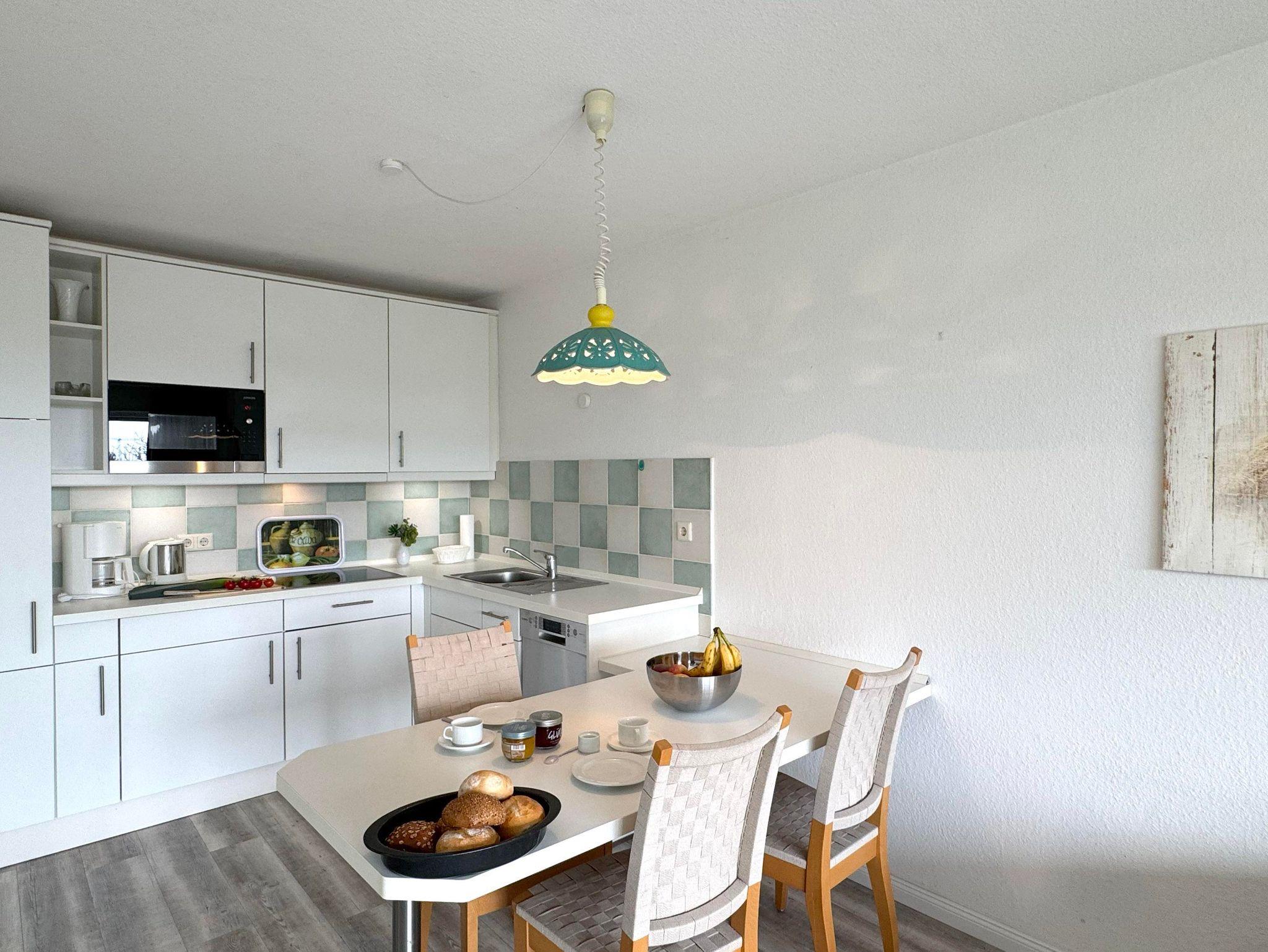 • komplett eingerichtete Küche, Mikrowelle, Geschirrspüler, Kühlschrank mit Gefrierfach, Wasserkocher, Kaffeemaschine (Filter), Toaster.