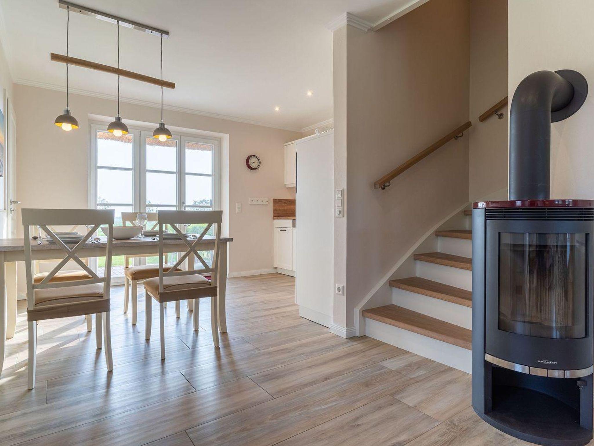 Im Erdgeschoss befindet sich der lichtdurchflutete Wohnraum mit TV, Kamin, einer offenen Küche sowie einem stilvollen Essbereich.