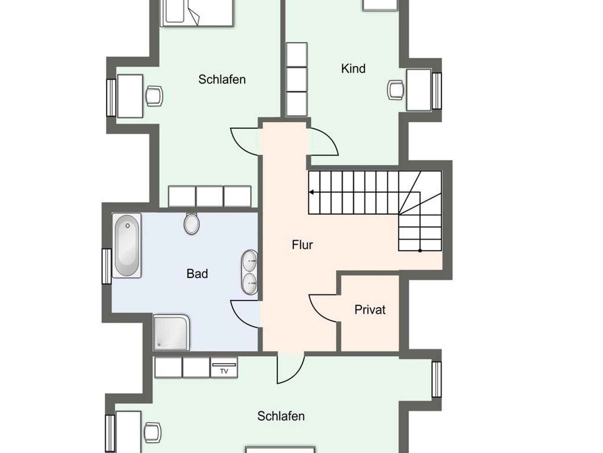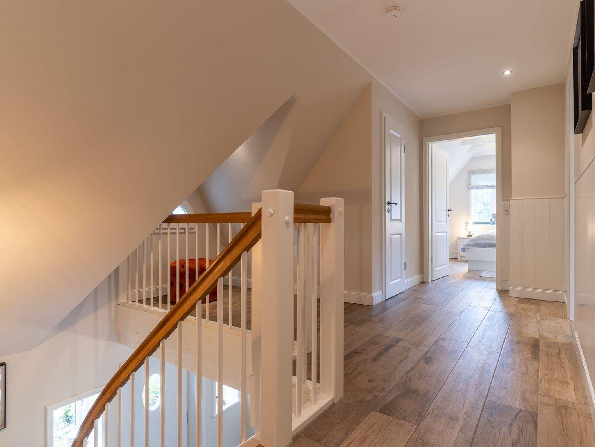 Eine Holztreppe führt Sie ins Obergeschoss, wo zwei weitere stilvoll eingerichtete Schlafzimmer mit komfortablen Doppelbetten (1x 200 x 210 cm + TV und 1x 160 x 200 cm) und ein weiteres Schlafzimmer mit einem Einzelbett (1x 100 x 200 cm) auf Sie warten. Ein geräumiges Badezimmer mit Dusche und Badewanne sorgt für zusätzlichen Komfort.