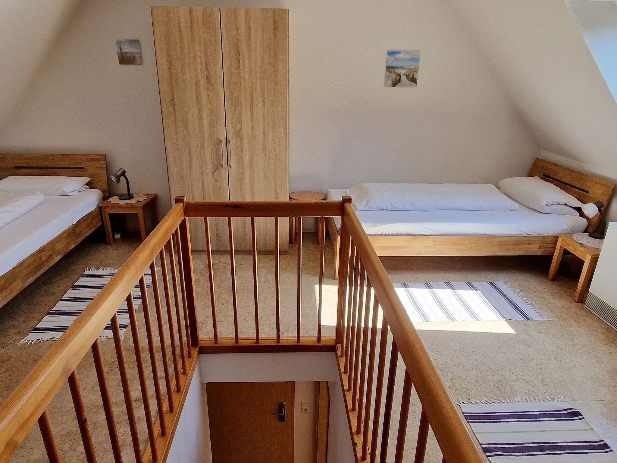 Schlafzimmer 22 Einzelbetten, 2 Nachttische, Kleiderschrank, Tisch, 2 Sessel, Nachtspeicherofen, Schrank, Staubsauger, Bügeleisen, Couch, Couchtisch, Treppe nach unten