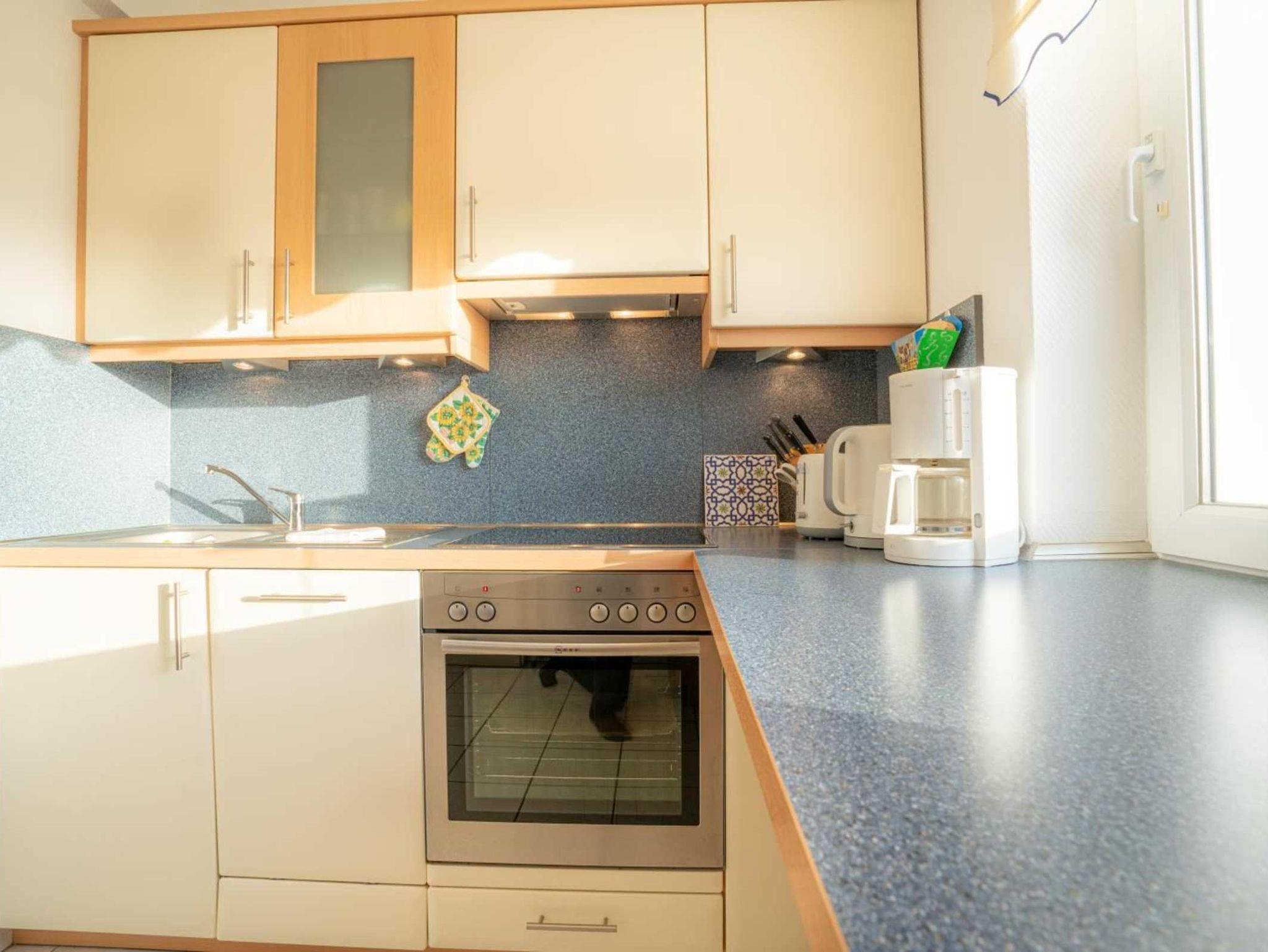 Separate Küche mit Backofen, Mikrowelle, Geschirrspüler und Kühlschrank mit Gefrierfach.