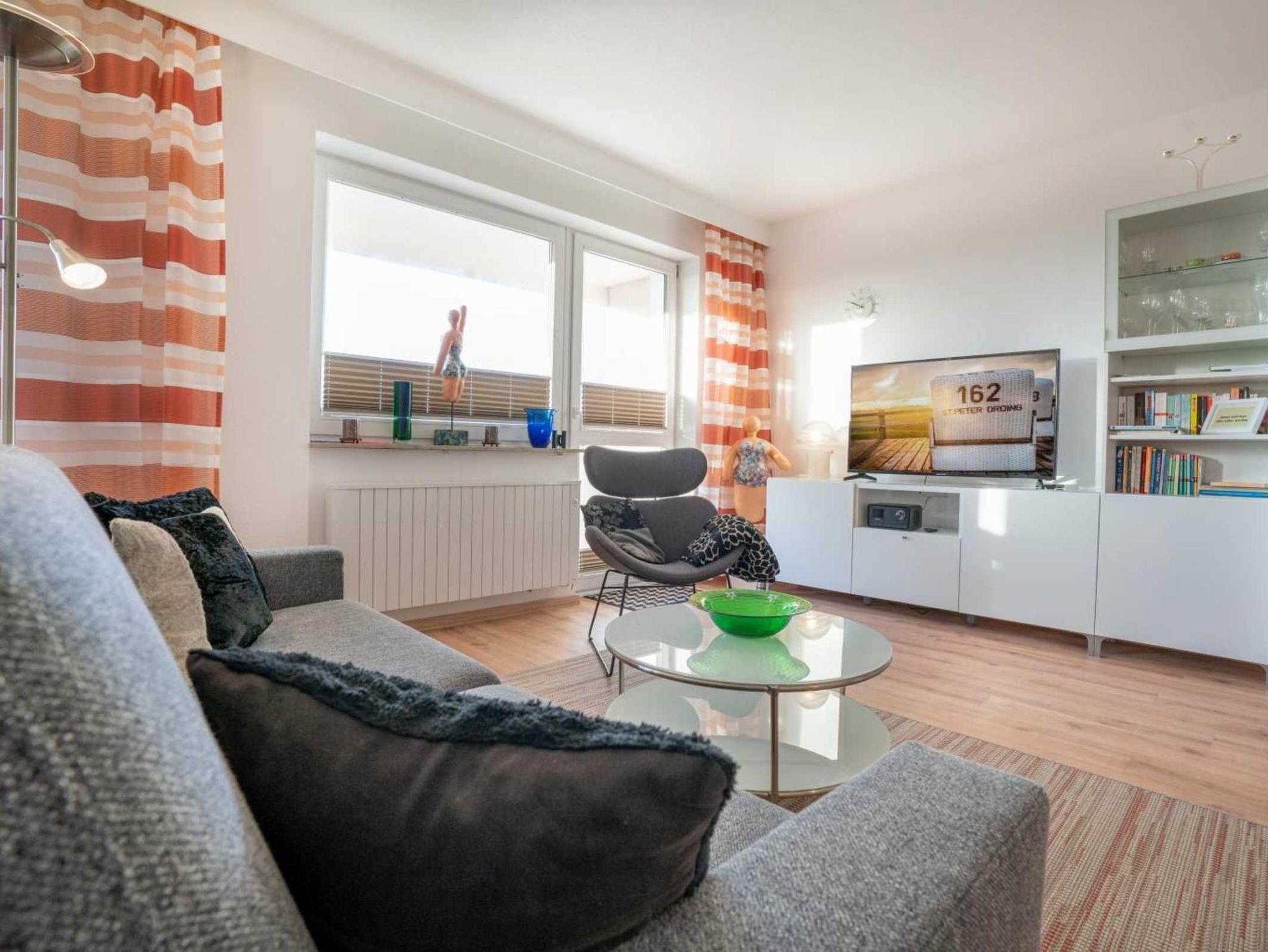 Wohnzimmer mit Schlafsofa (140x200cm), 2 Sesseln, SMART-TV (Kabel), Internet-Ratio mit Bluetooth-Funktion und Esstisch mit 4 Stühlen. Direkter Zugang zum möblierten, windgeschützten Balkon nach Südwesten.