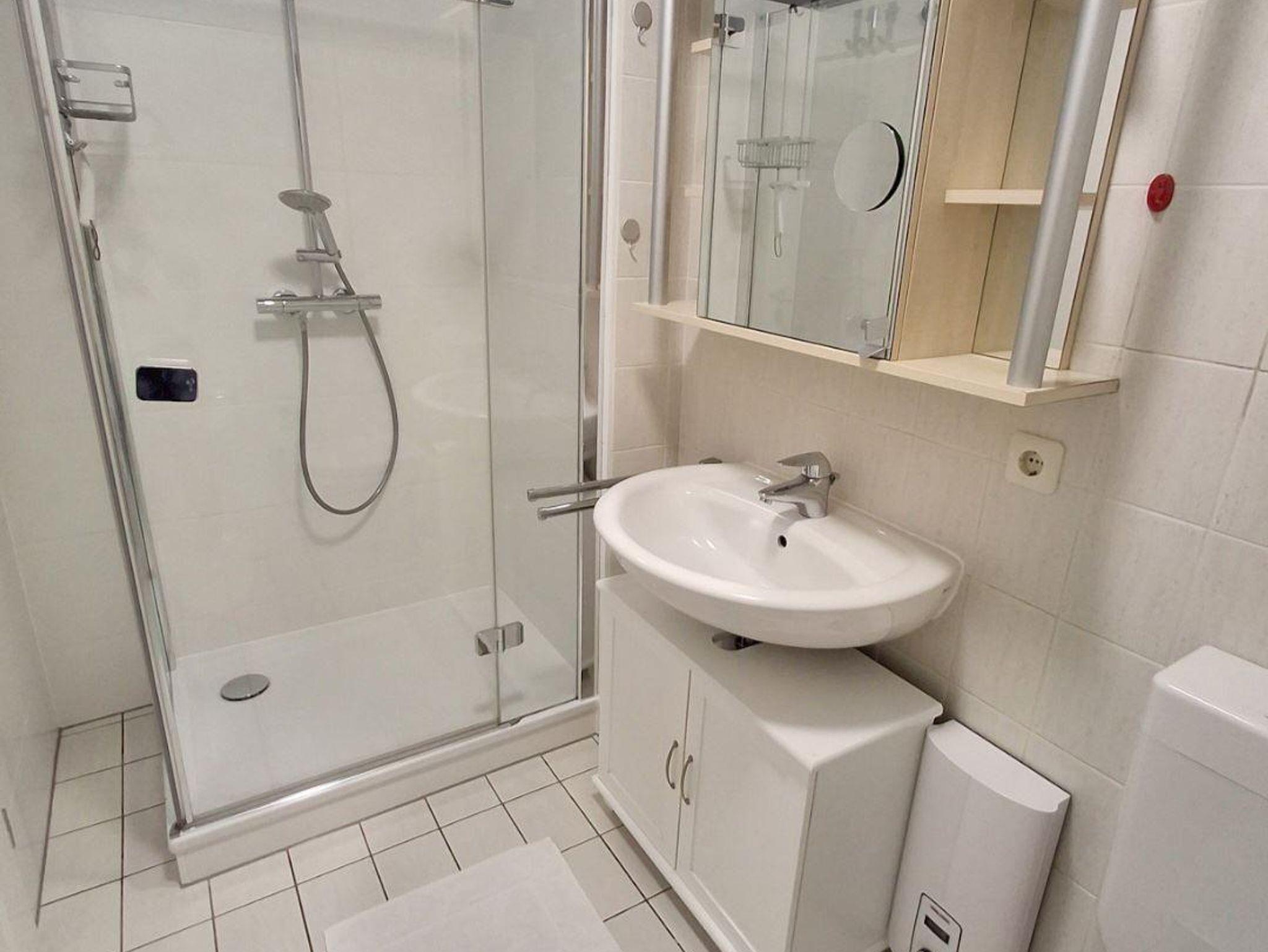 Bad: Dusche, Waschbecken, WC, Regal, Hocker, Duschkabine, Spiegelschrank