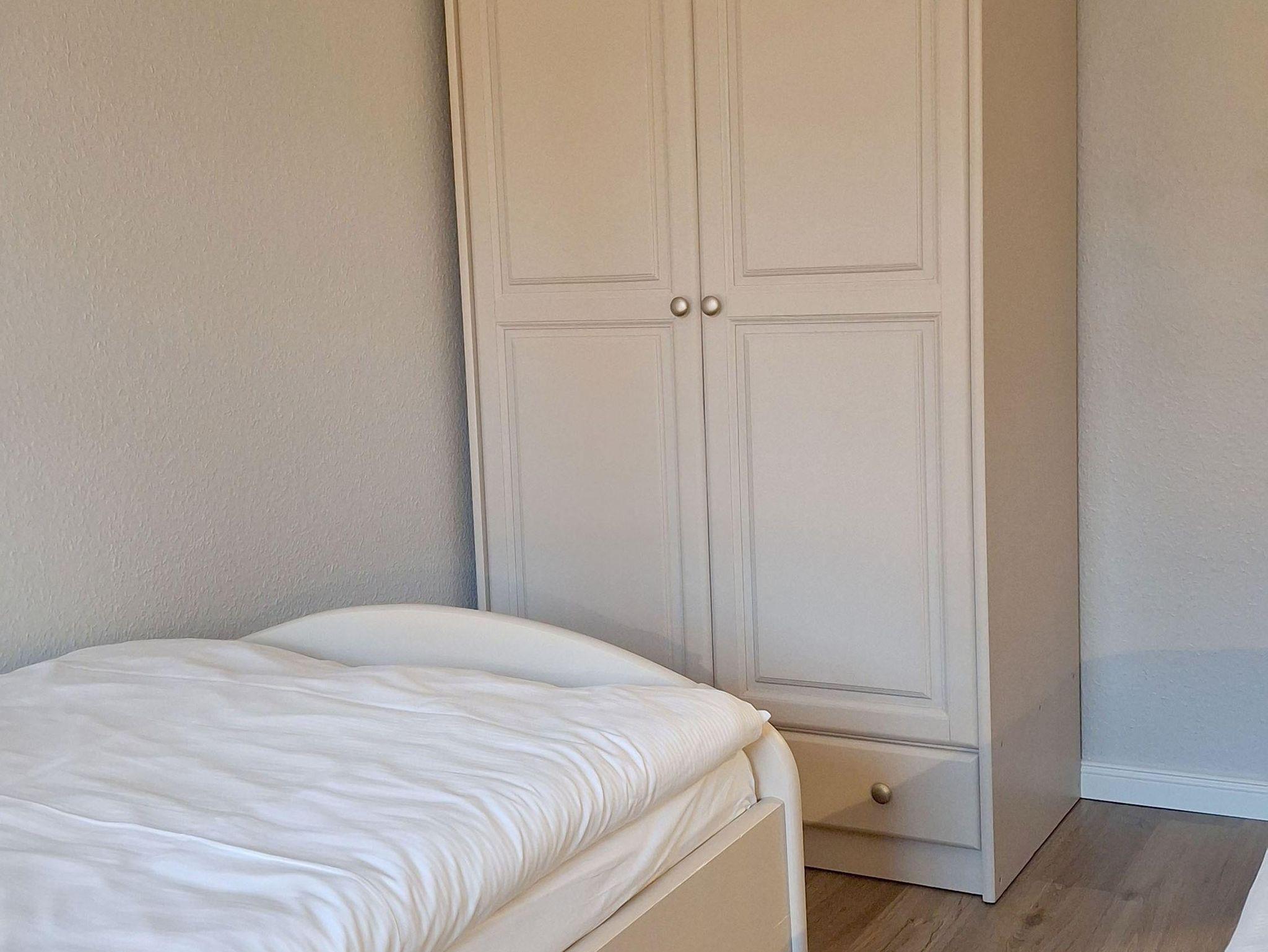 Schlafzimmer: 2 Einzelbetten, Nachttisch, 1 Elkatherm Flächenheizkörper, Kleiderschrank, Stuhl
