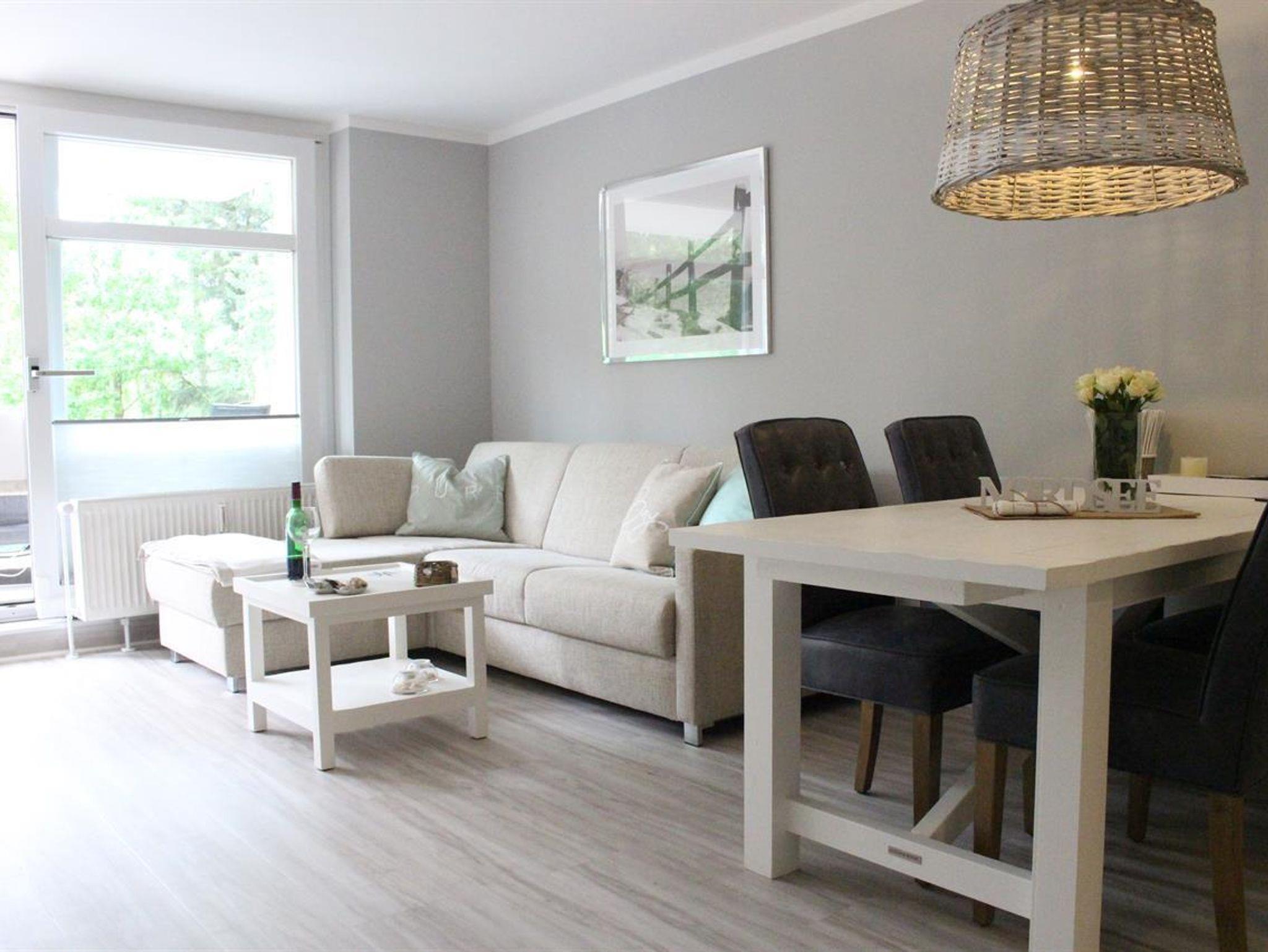 Im Wohnzimmer finden sie eine bequeme Schlafcouch (140 x 200 cm), einen Couchtisch, eine Stehlampe aus 'drift wood', eine große Deckenlampe, ein Sideboard und Regal von ocean house, einen großen Esstisch mit 4 Stühlen von Riviera Maison, Plissee's, ein Kabel-TV mit Flachbildschirm, ein Blu-ray/DVD-Player, eine DVD-Sammlung und ein Radio mit CD-Player (Sie können natürlich Ihre persönliche Musik via Bluetooth ab spielen)