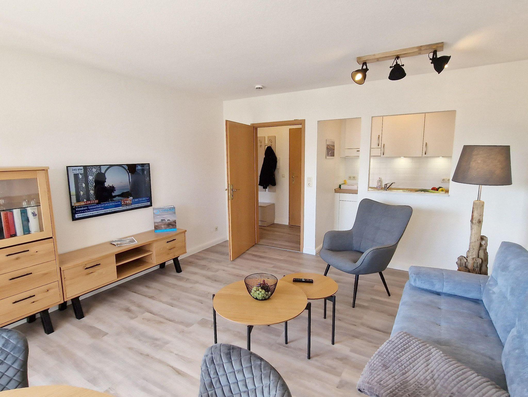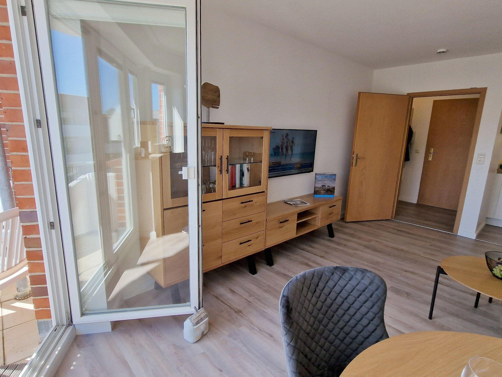 Hell und freundlich empfängt Sie die 2-Zimmer-Ferienwohnung Hauke Haien Nr. 14 für bis zu 4 Personen im 4. OG. Zum Schlafen haben Sie außer dem Schrankdoppelbett im Wohnzimmer noch zwei Einzelbetten im Schlafzimmer. Die Küche ist mit einem 4-Plattenherd und einem Backofen bestückt und Sie können ins deutsche Festnetz telefonieren. Gute Nordseeluft schnuppern Sie auf dem Süd-Ost-Balkon.
