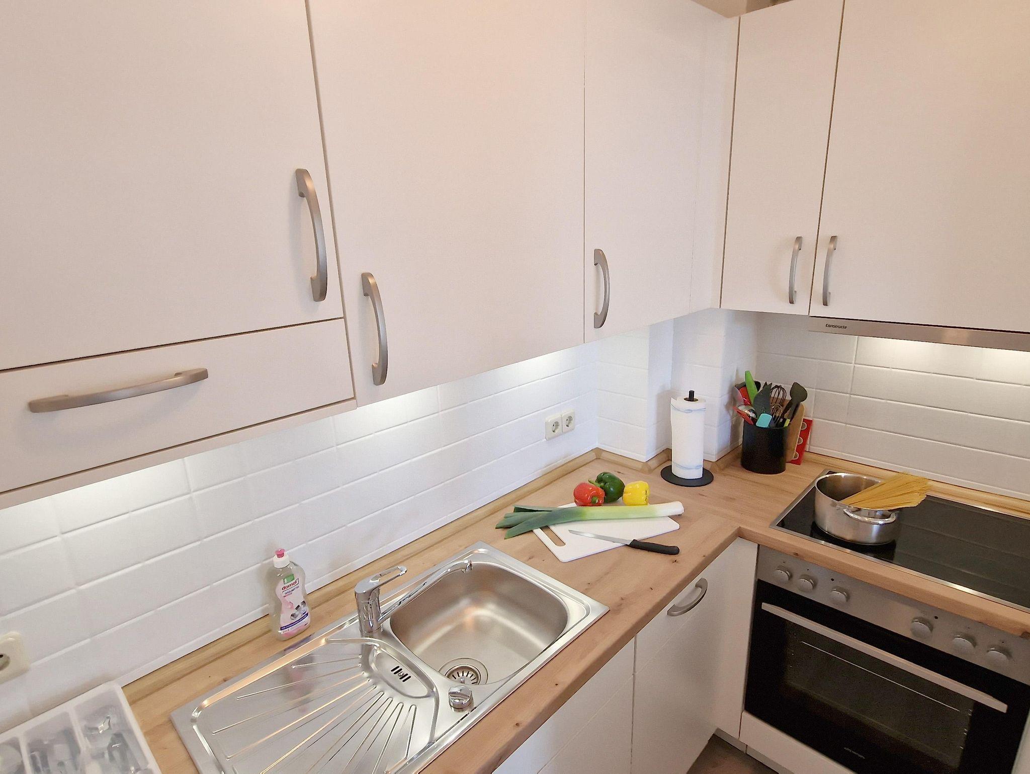 KücheEinbauküche, 4 Plattenherd mit Backofen, Dunstabzugshaube, Kühlschrank, Kaffeemaschine, Wasserkocher, Toaster, Geschirr, Kochtöpfe
