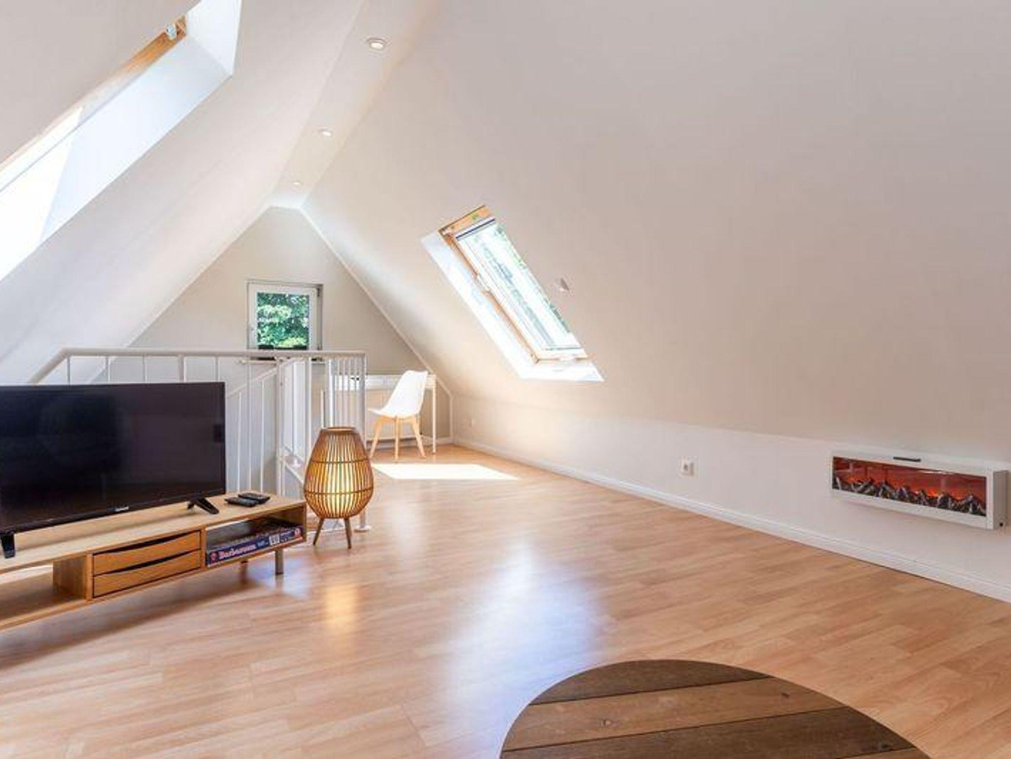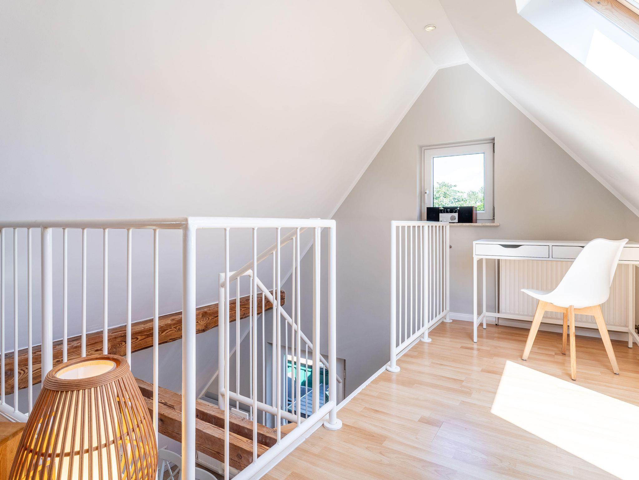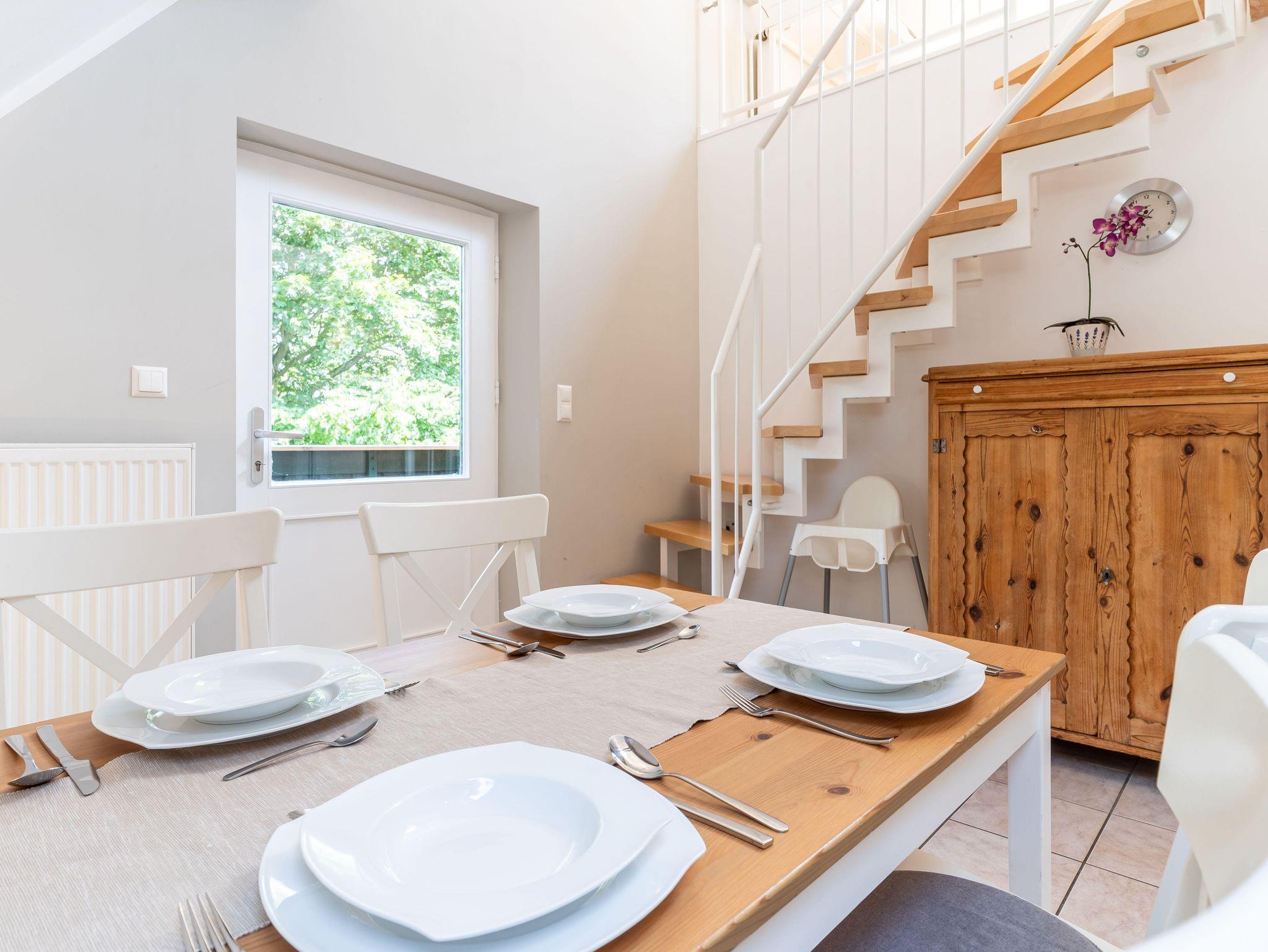 Die zwei separaten Schlafzimmer verfügen über ein Doppelbett und zwei Einzelbetten. Von der Küche mit Essbereich führt eine Treppe auf die 2. Ebene ins Wohn-Studio.