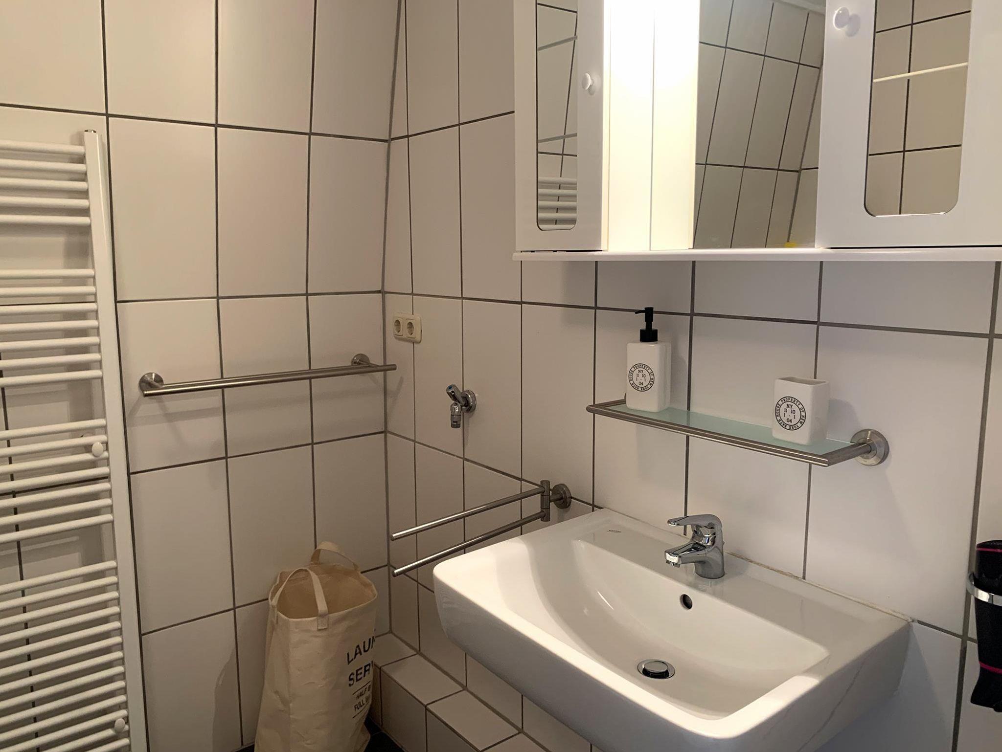 Bad: Waschtisch, Dusche, WC, Spiegelschrank, Duschkabine WC