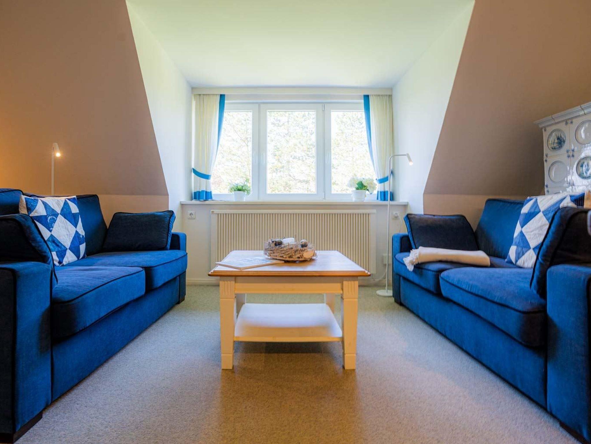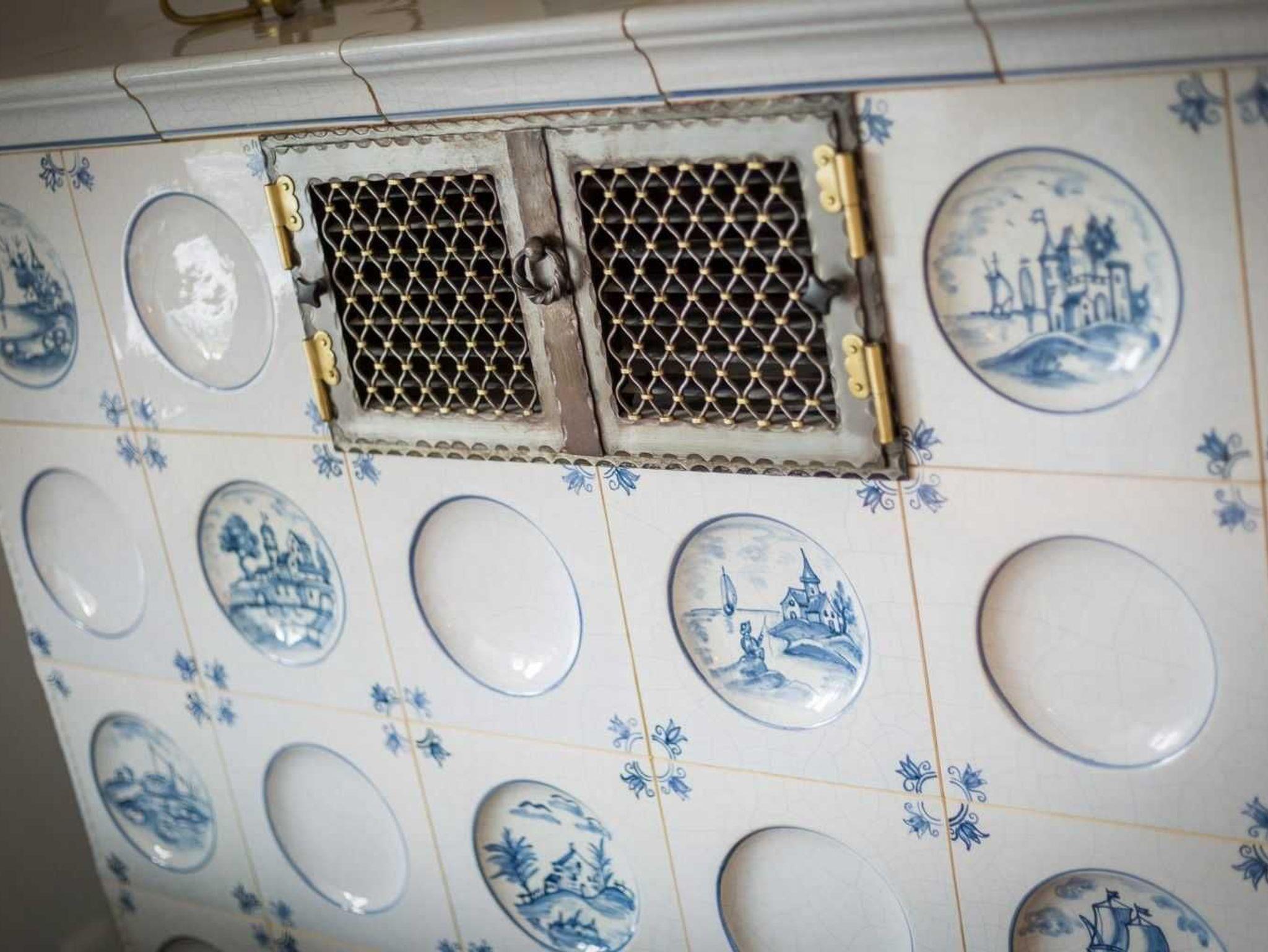 Behagliches Wohnzimmer mit 2 Sofas (jeweils 2er), kleiner Bibliothek, großem Zierofen mit klassischen Friesenkacheln und Esstisch mit uriger Eckbank für 3 Personen und 2 Stühlen.