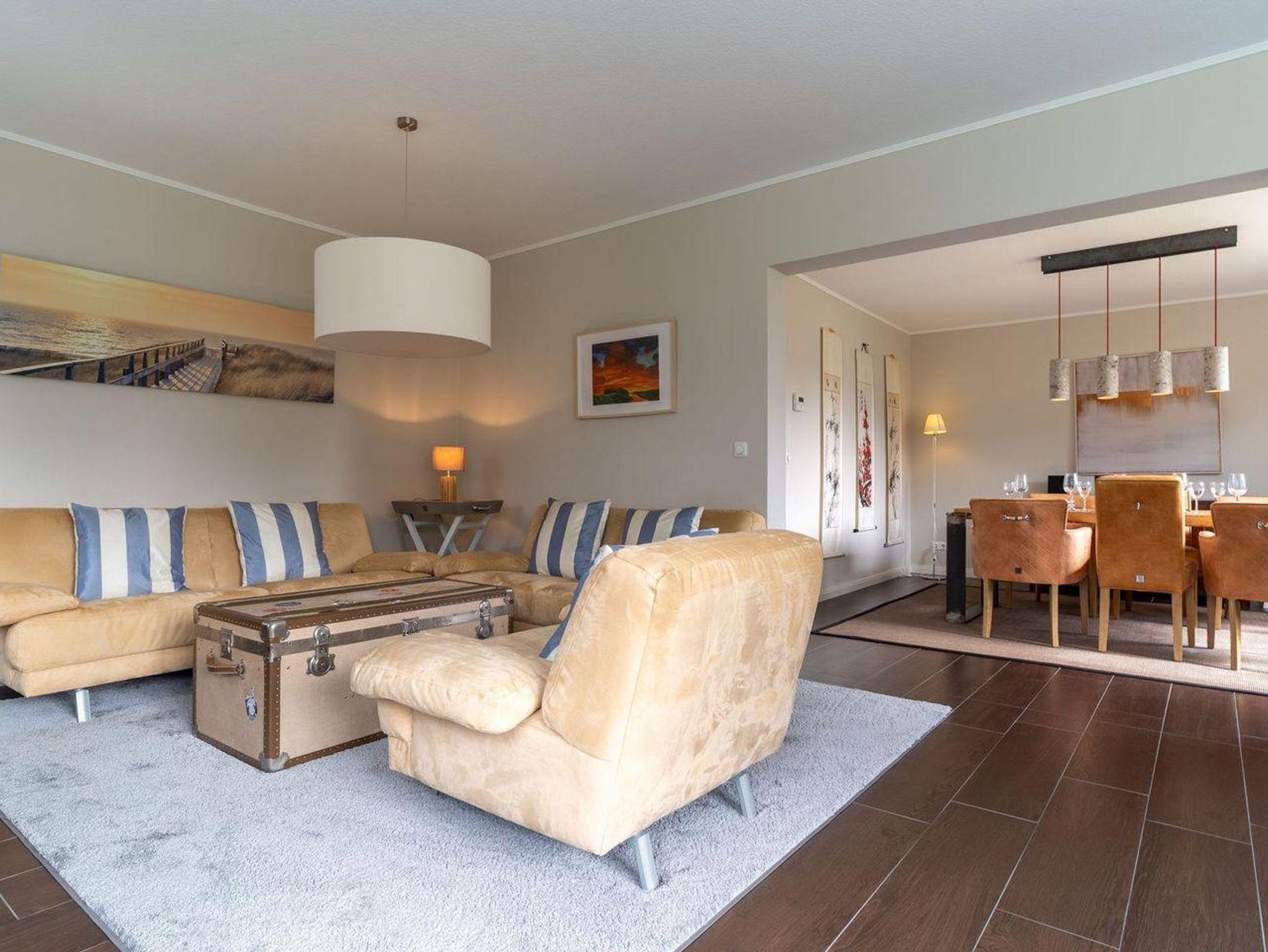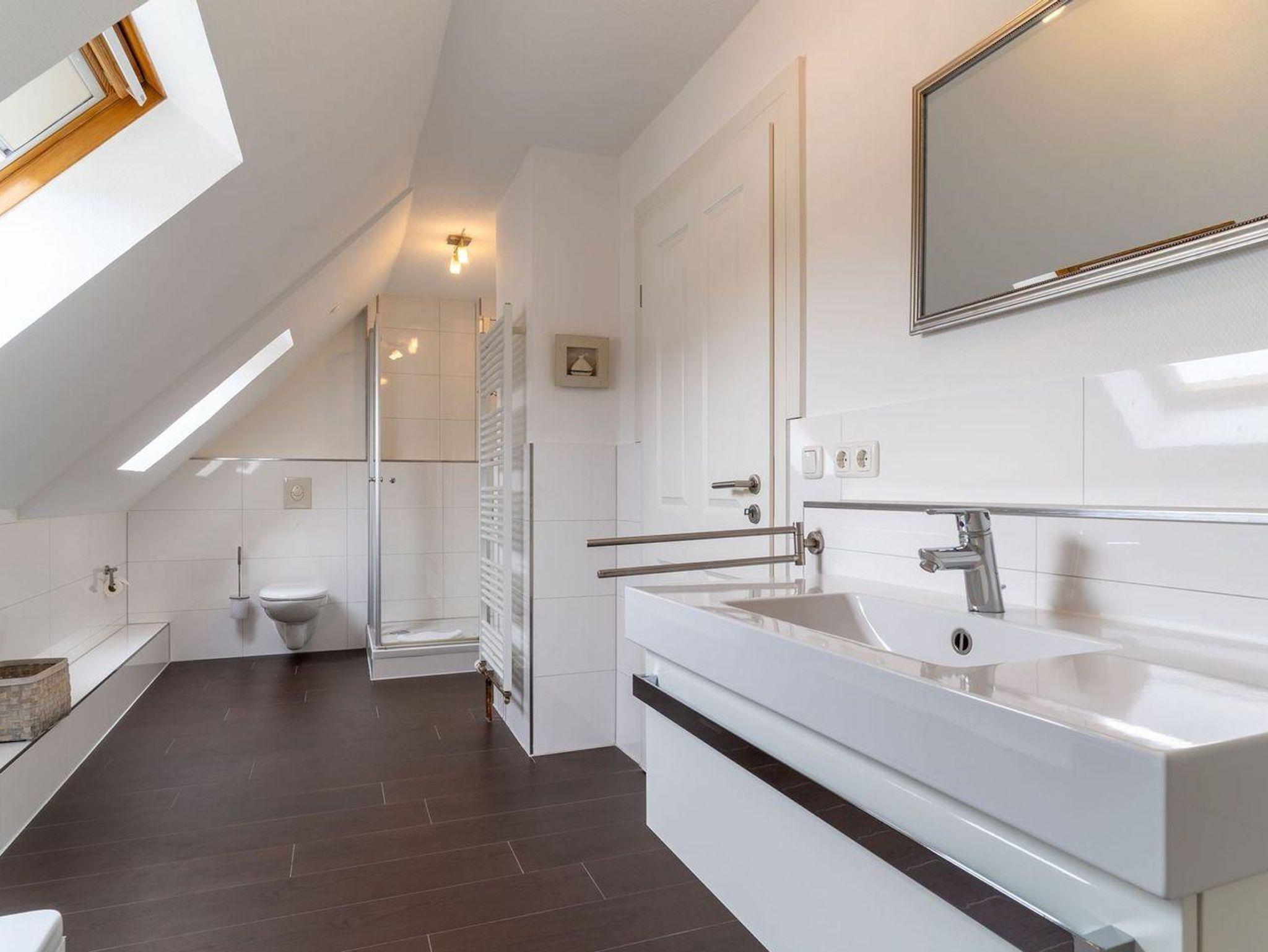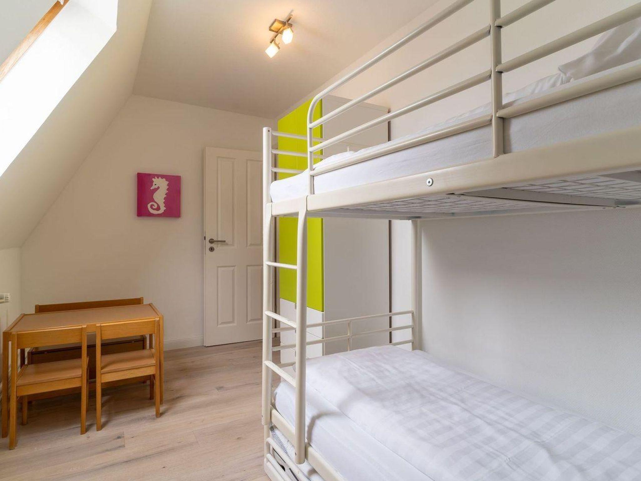 Im Erdgeschoss befindet sich der lichtdurchflutete Wohnraum mit TV und einem großzügigen Essbereich. Die Wohnräume sind mit Möbeln im shabby look ausgestattet. Vom Flur aus gelangt man in die voll ausgestattete Küche mit gemütlichen Sitzbänken. Außerdem ist im Erdgeschoss ein Duschbad und ein Einzelschlafzimmer mit Schreibtisch und einer Infrarot-Wärmekabine. Über eine Treppe gelangt man in das Obergeschoss. Die drei Schlafzimmer, zwei mit einem Doppelbett und eins mit einem Etagenbett sorgen für ruhmvolle Erholung. Darüber hinaus befindet sich im Obergeschoss ein weiteres Duschbad mit einer Badewanne.