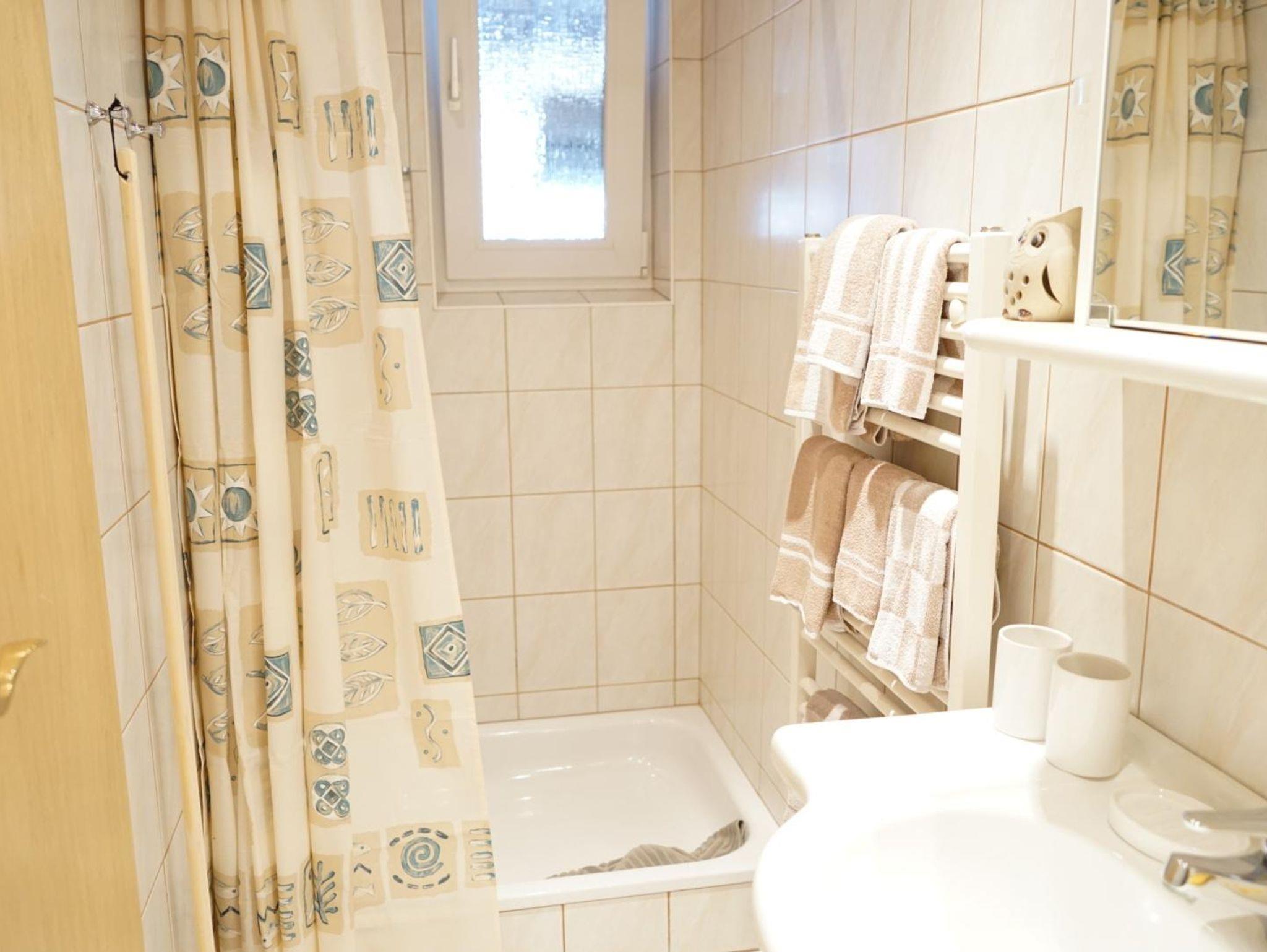 Das eigene Badezimmer ist mit Dusche, einem Waschbecken mit Spiegel und einem WC ausgestattet.