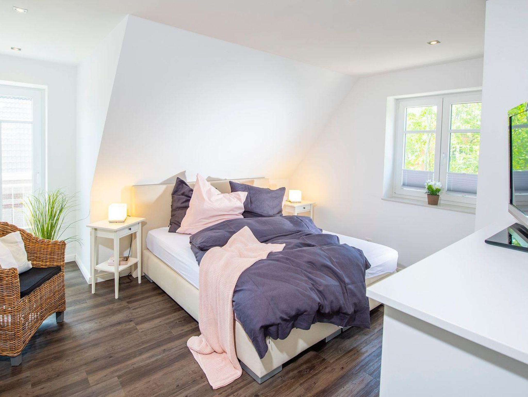 Im Spitzboden im 2. Obergeschoss erwartet Sie ein weiters Schlafzimmer mit einem Boxspringbetten (140 x 200 cm) und einer gemütlichen Sitzecke mit Sofa und Fernseher.