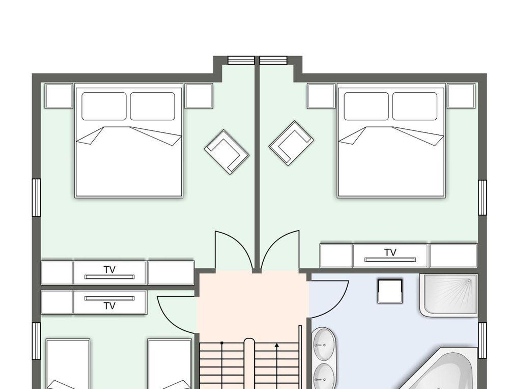 Im 1. Obergeschoss finden Sie zwei Schlafzimmer mit komfortablen Boxspringbetten (180 x 200 cm), ein Schlafzimmer mit zwei Einzelbetten (90 x 200 cm) und ein Badezimmer mit Dusche, Badewanne und WC.