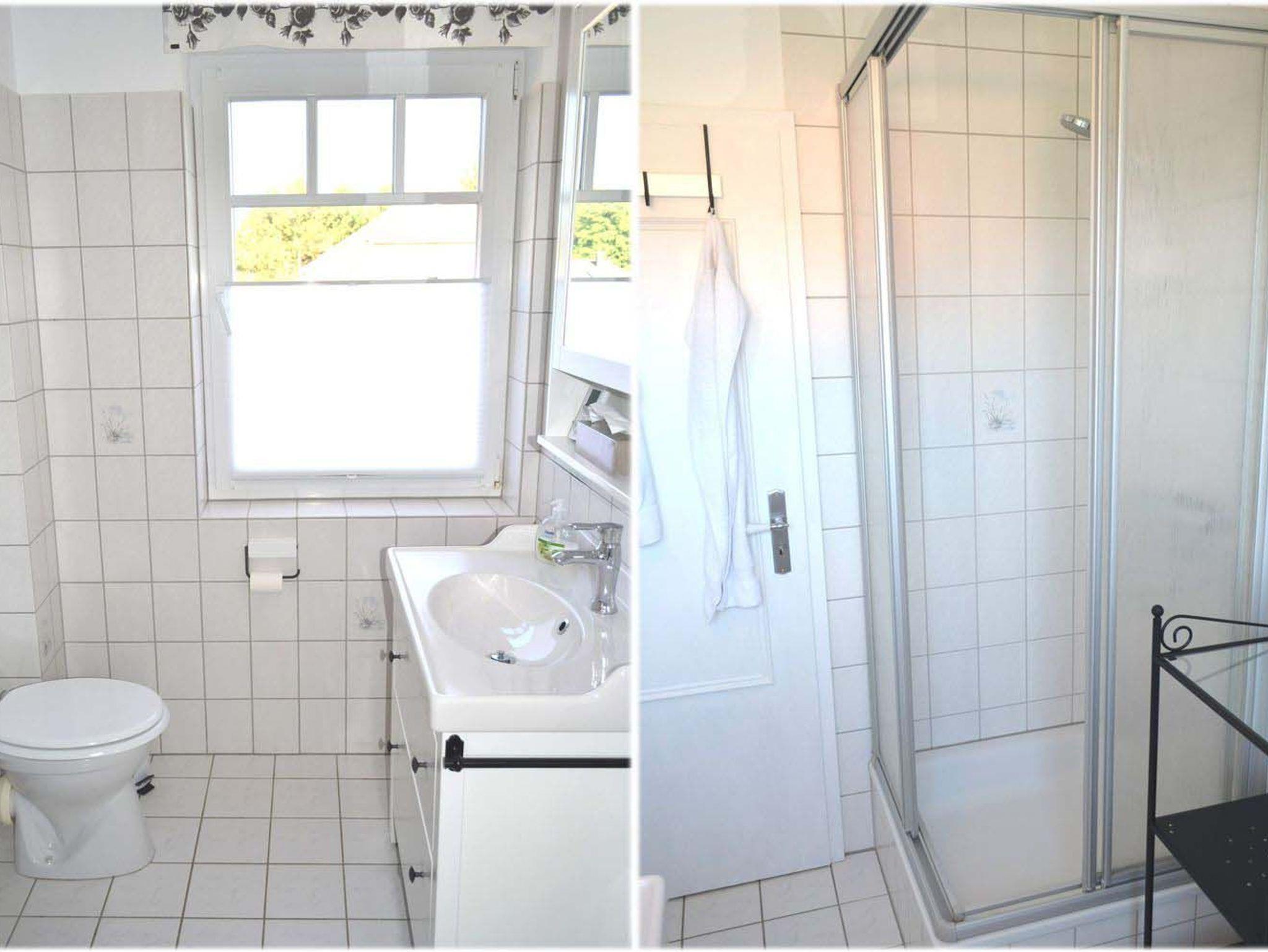 Bad: Dusche, Duschkabine, Fön, Regal, Spiegelschrank, Waschtisch, WC
