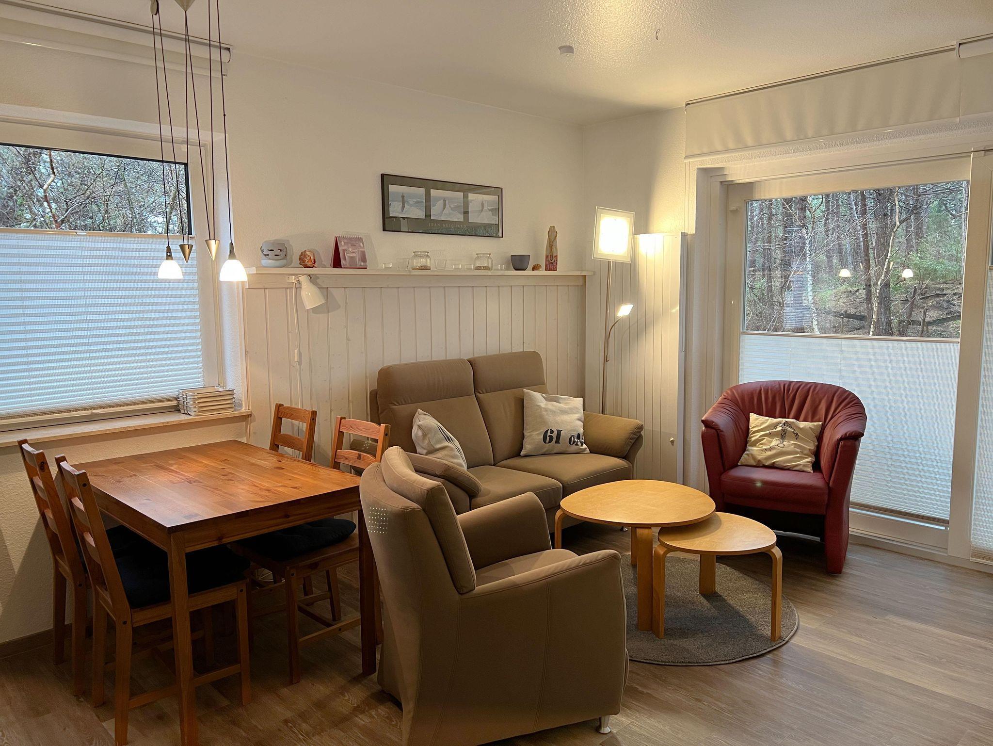 Wohnzimmer: Couch, Couchtisch, 2 Sessel, 2 Stehlampen, JAWO Elektro Direktheizung, TV-Schrank, Schrankdoppelbett, Kleiderschrank, Kabel-TV, Flachbildschirm, Stereoanlage, Esstisch, 4 Stühle, Küchenzeile, 4 Plattenherd mit Ceranfeld und Backofen, Dunstabzugshaube, Kühlschrank, Spülmaschine, Kaffeemaschine, Wasserkocher, Toaster, Geschirr, Kochtöpfe