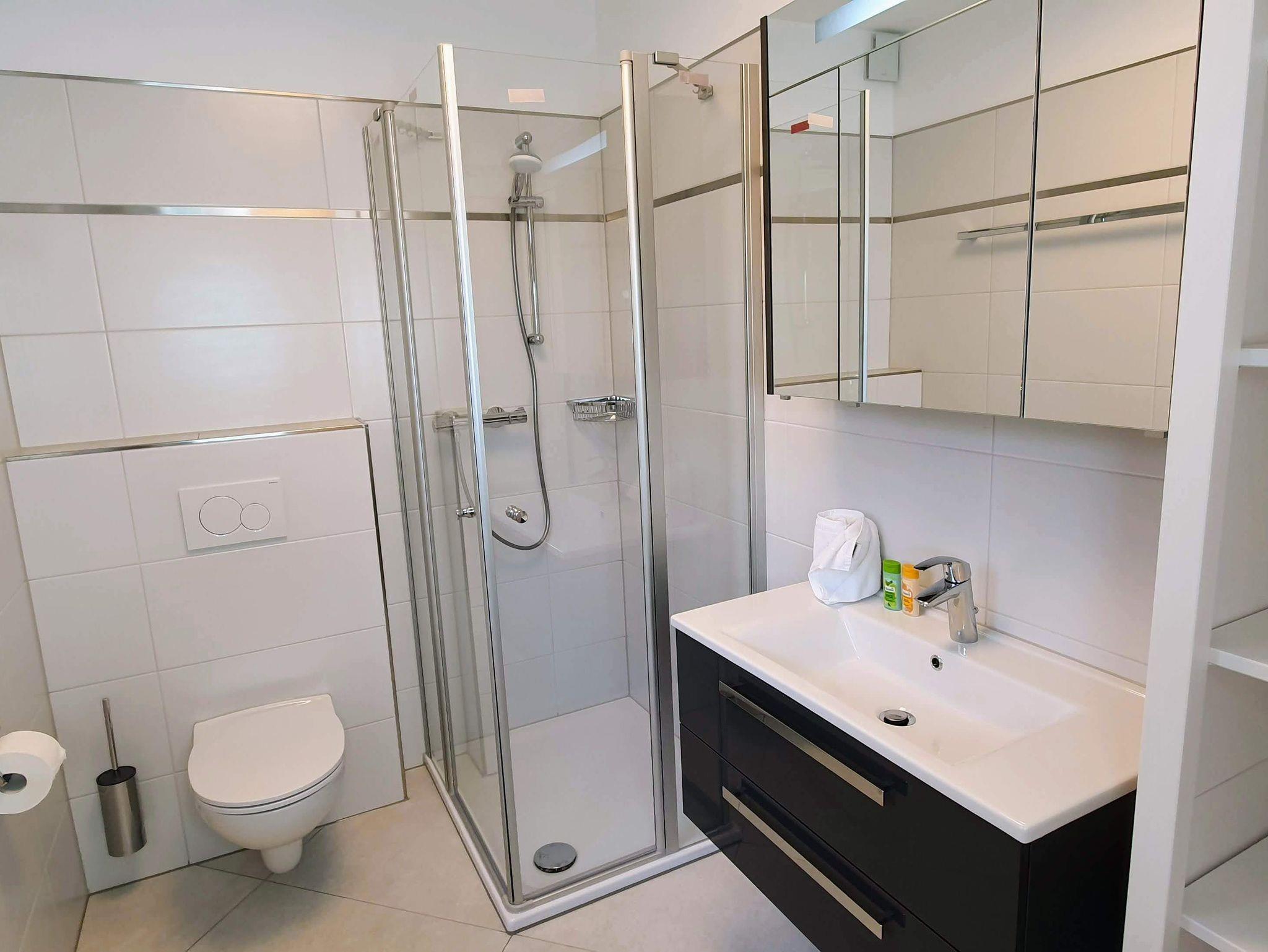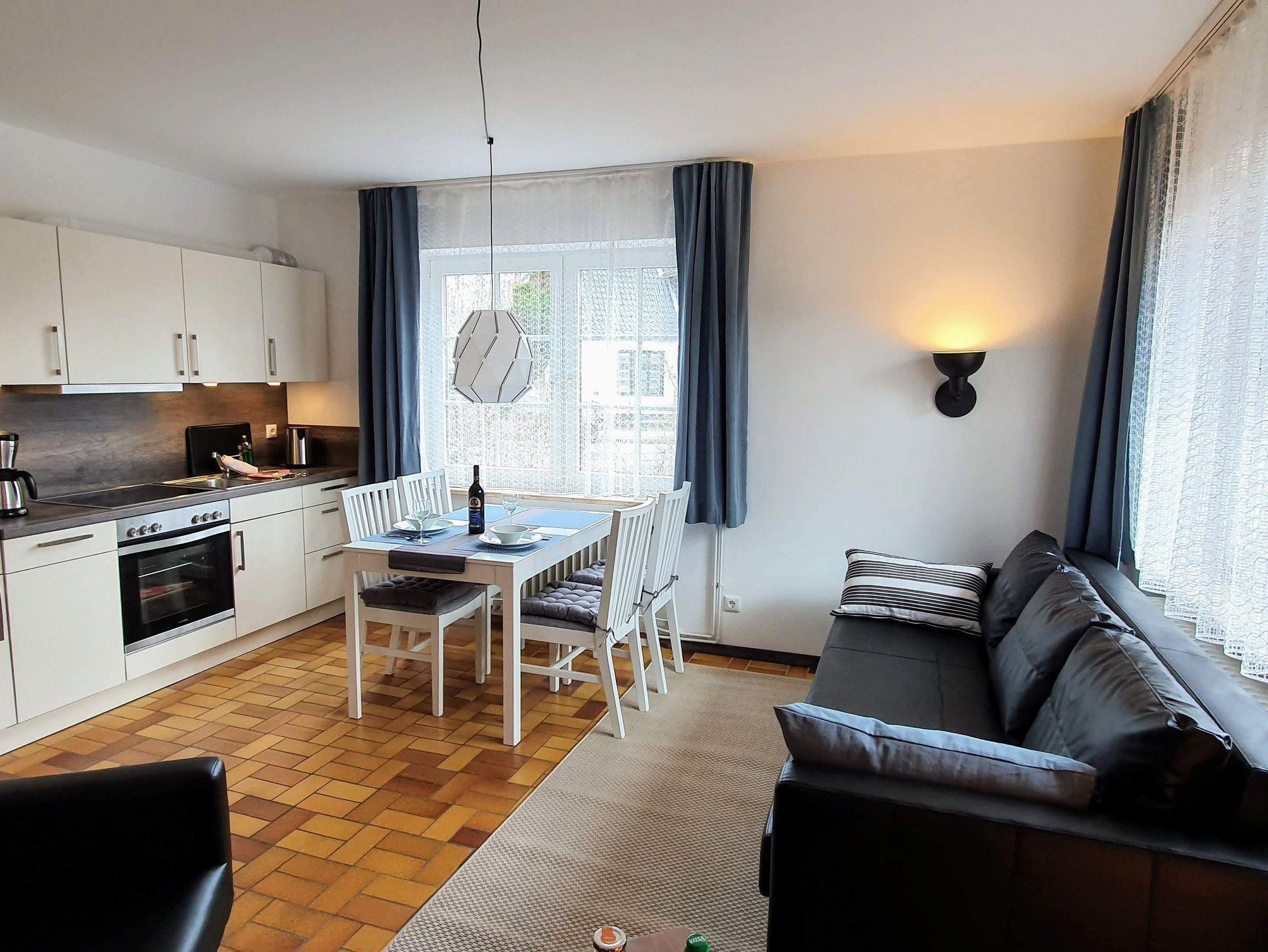 Wohnraum und integrierter modernen Einbauküchenzeile mit Ceranfeld, Backofen, Geschirrspüler, Kaffeemaschine, Wasserkocher, Kühlschrank mit Gefrierfach, Toaster ausgestattet. Das Schlafzimmer mit Doppelbett und eingebautem Kleiderschrank befindet sich im Obergeschoß. Neues modernes Duschbad/WC.