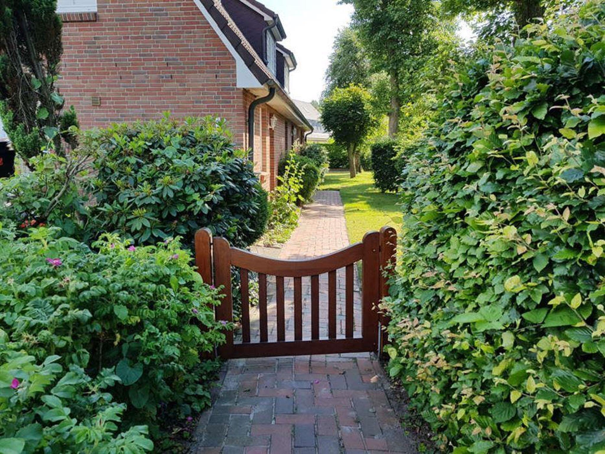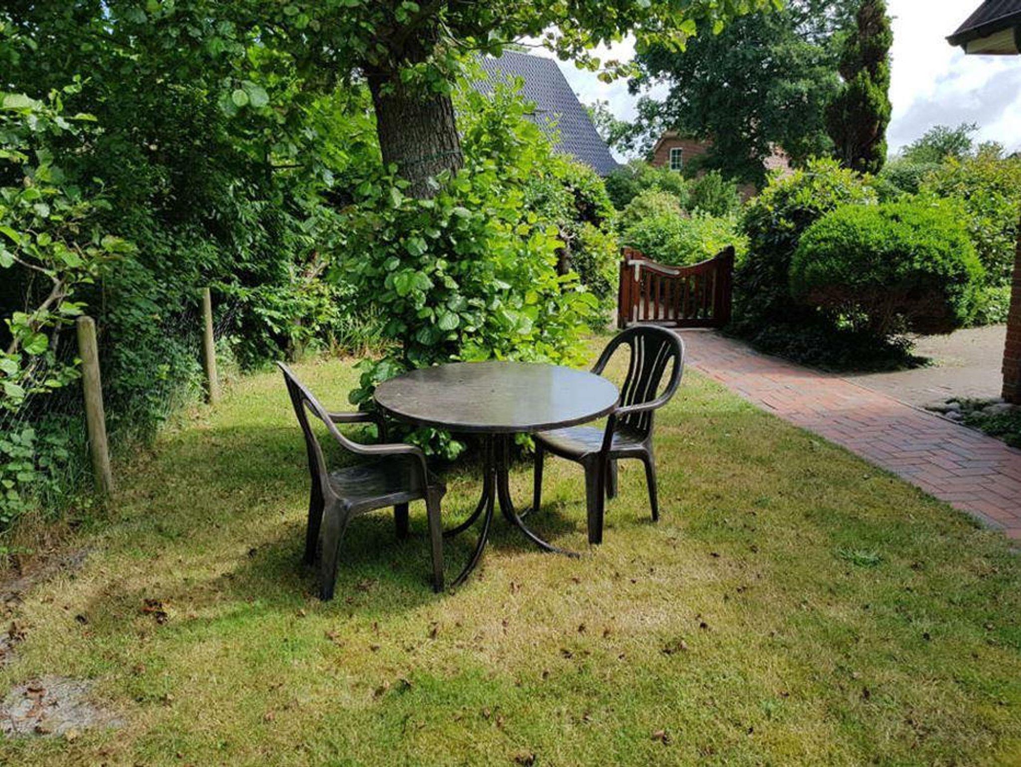 Zu den Ferienwohnungen gehören eine Sitzecke mit Gartenmöbel im Garten.