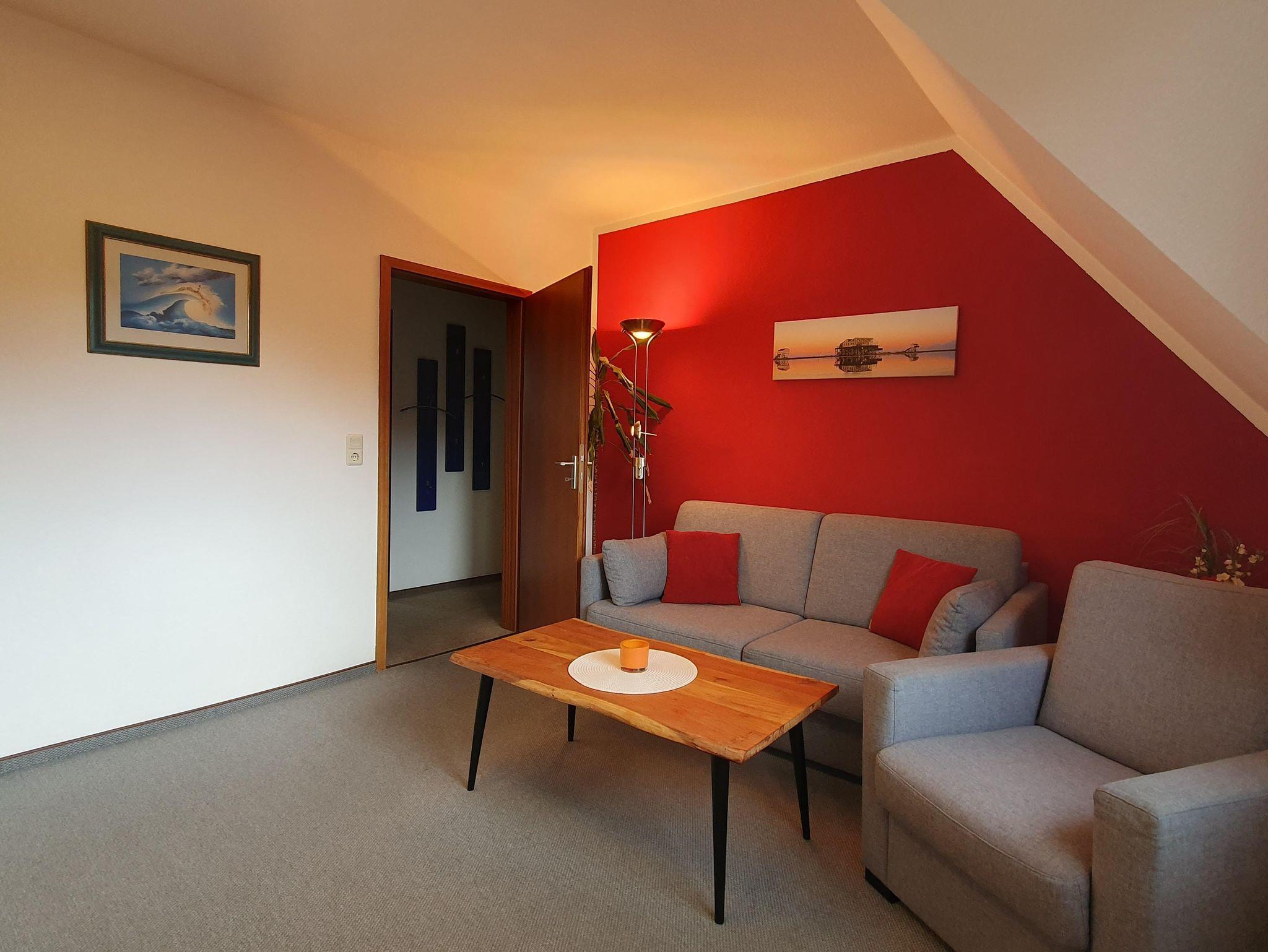 1 Wohnzimmer mit Couch, Flat-TV und Stereoradio mit CD-Player. W-LAN kostenlos. Kleiner Südbalkon zum sich wohlzufühlen.