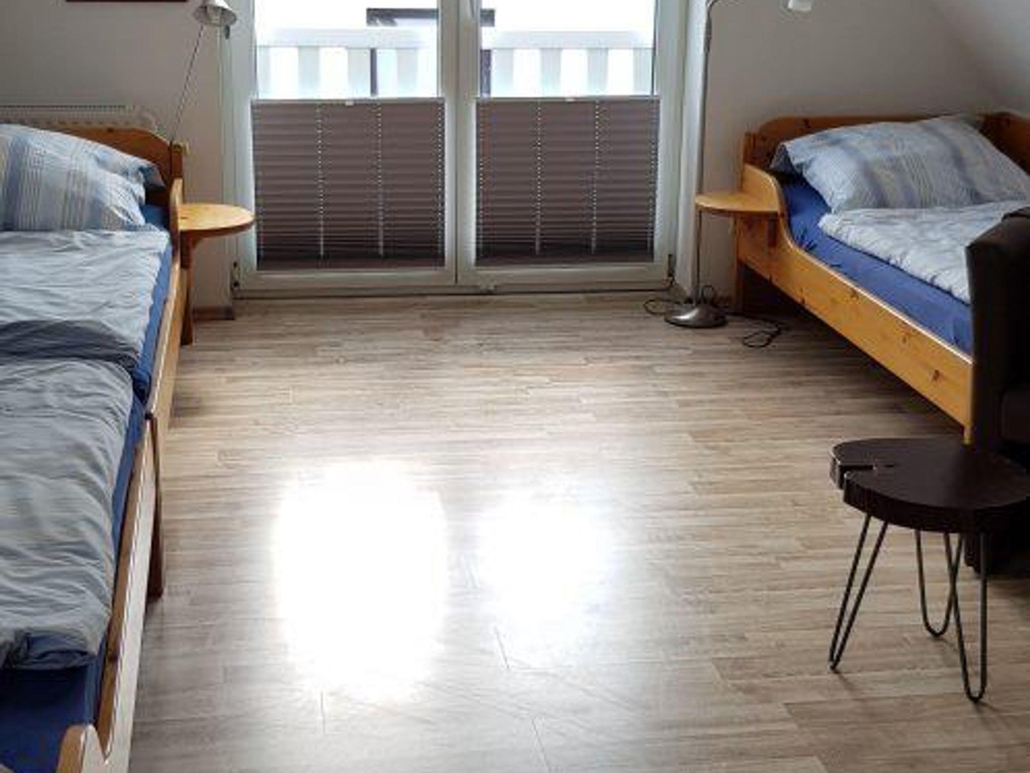 Schlafzimmer mit 3 Einzelbetten, kleiner Sitzbereich. Bodentiefe Fenster (Fenstergriff nicht abschließbar) mit franz. Balkon (Geländer).