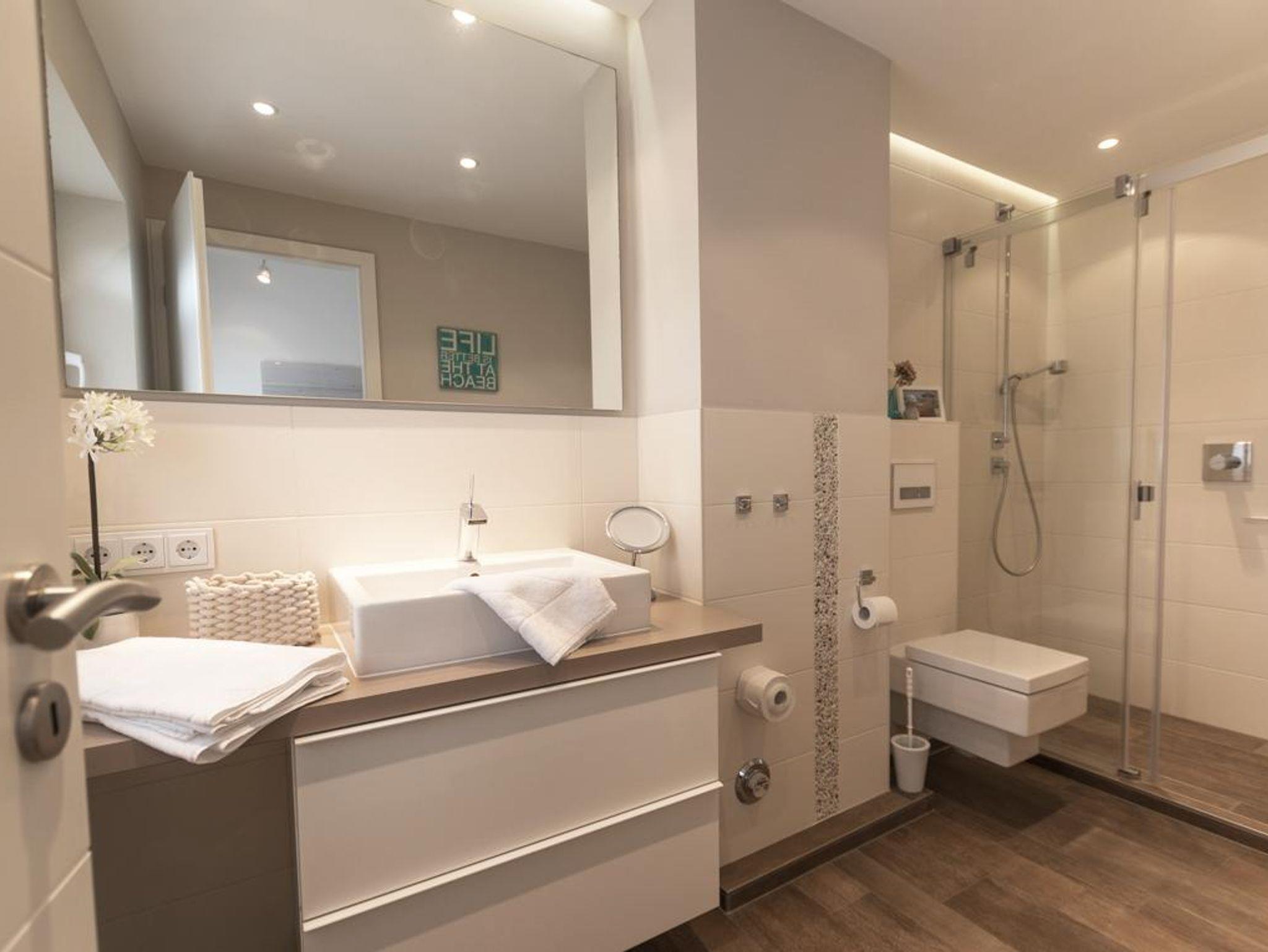 Das Badezimmer im schönen Naturdesign ist mit modernen Sanitärobjekten und mit Fußbodenheizung ausgestattet. Der großzügige Duschbereich bietet höchsten Komfort.