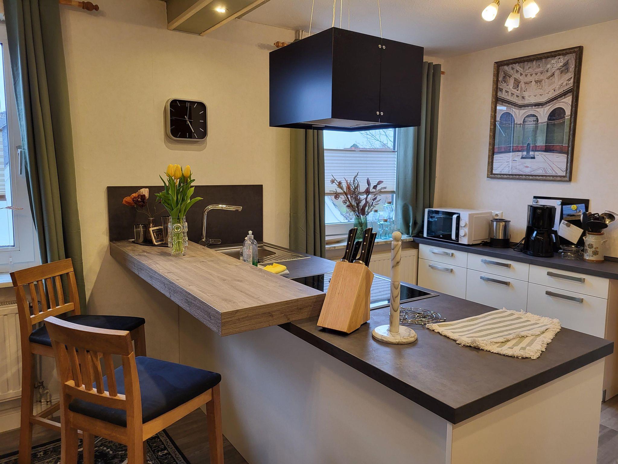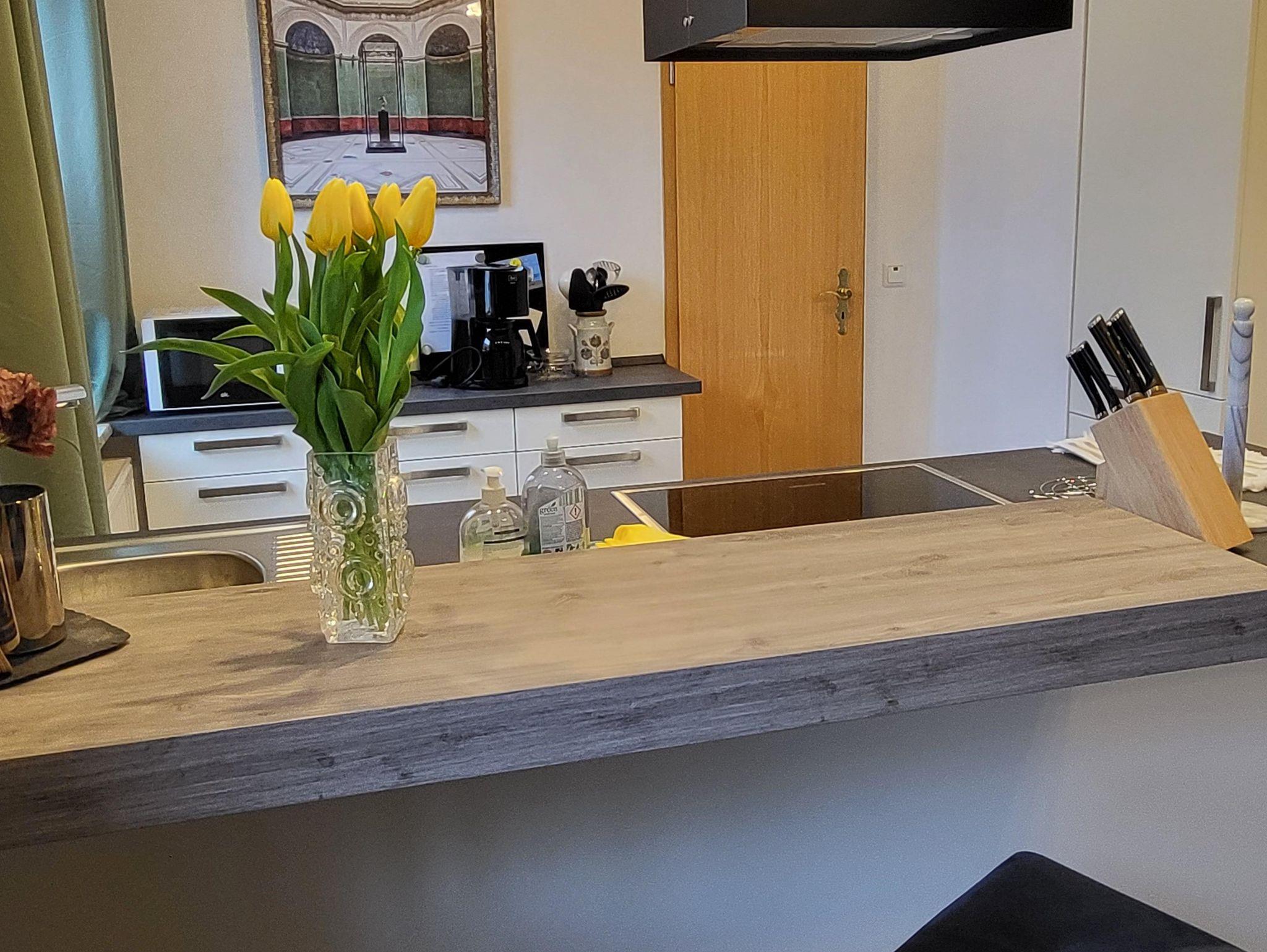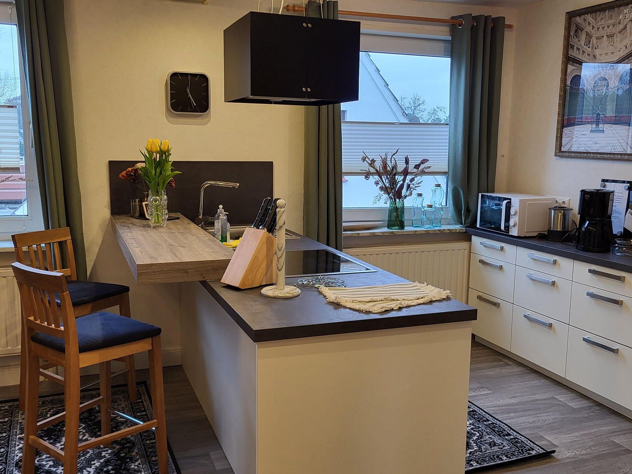 Es wurde der ganze Wohnbereich neu gestaltet und mit einer modernen Wohnküche mit schönen Küchenmöbeln und neuen Geräten ausgestattet. Zu der Ausstattung gehören sämtliche elektrischen Größ- und Kleingeräte. Der schön gestaltete Esstresen läd zu langen Frühstücken im Urlaub ein.