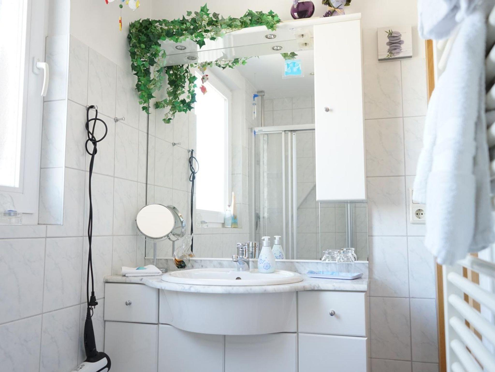Das eigene Badezimmer ist mit Dusche, einem Waschbecken mit Spiegel und einem WC ausgestattet.