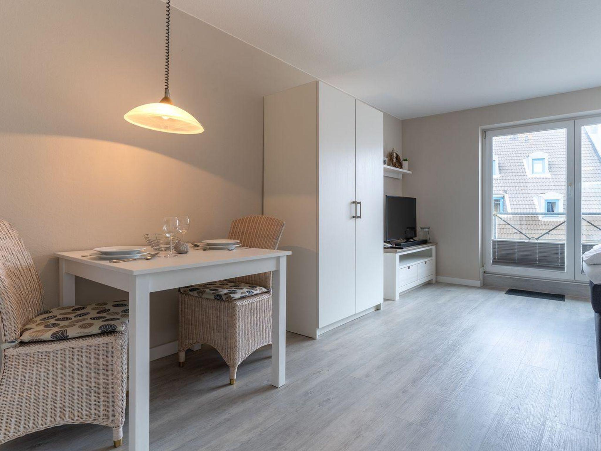 In dieser Wohnung können Sie sich zu Zweit wohlfühlen und am Abend bei einem Glas Wein die Sonne hinter dem Deich verschwinden sehen. Die 41 qm große Ferienwohnung bietet Ihnen einen schönen und hellen Wohnbereich mit einem Boxspringbett. Des weiteren ist ein Esstisch mit 2 Stühlen vorhanden. Die Küche der Wohnung ist ausgestattet mit einem 4 Plattenherd mit Backofen, Dunstabzugshaube, Geschirr, Kaffeemaschine, Kochtöpfe, Kühlschrank, Toaster und einem Wasserkocher.