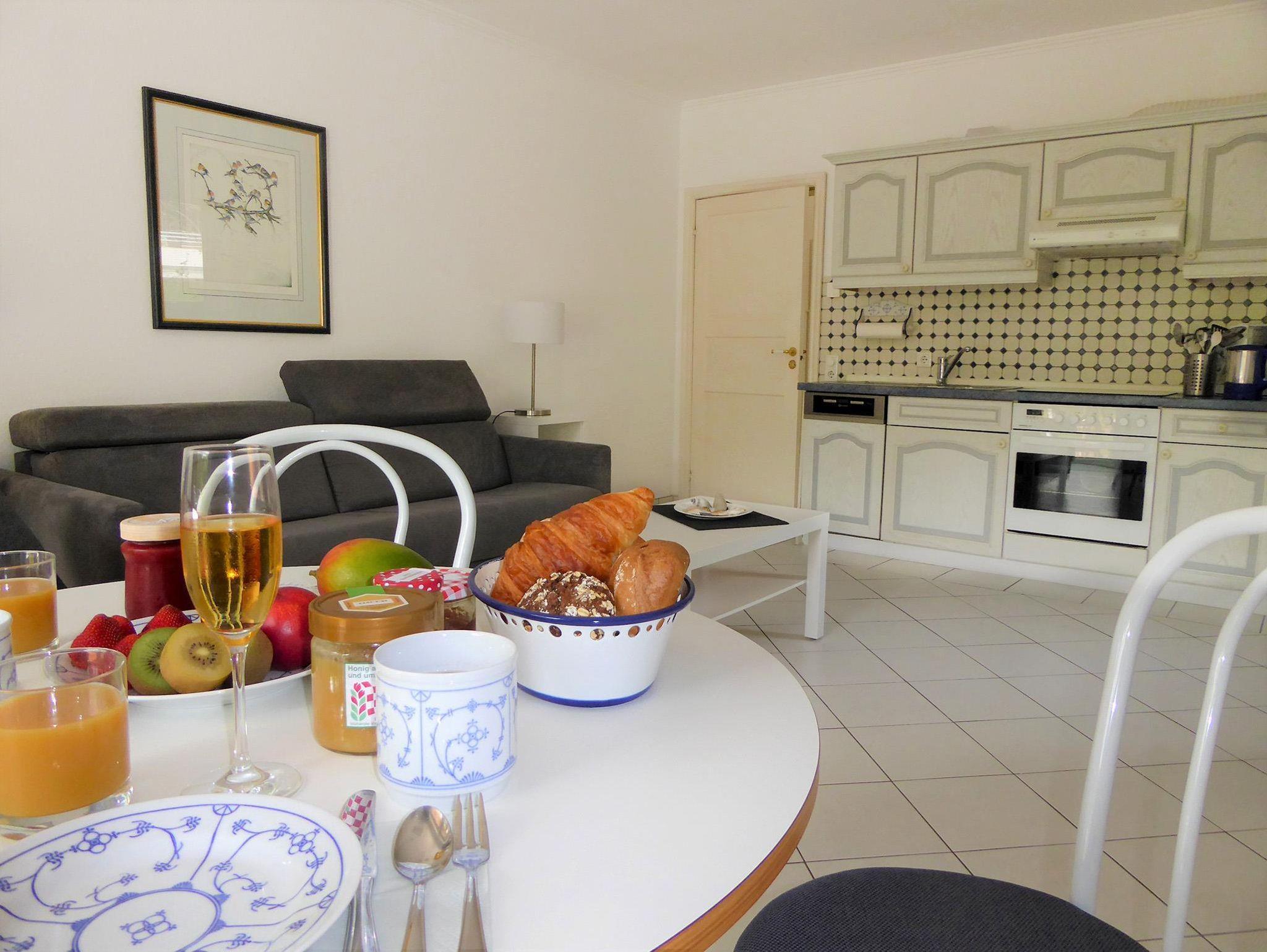 Wohnzimmer Schlafcouch (1,60 x 2,00 cm), Couchtisch, Sessel, 2 Beistelltische, 2 Tischlampen, Vitrinenschrank, Kabel-TV, Stereoanlage mit CD-Player, Nachtspeicherofen, Esstisch, 4 Stühle, Küchenzeile, 4 Plattenherd mit Ceranfeld und Backofen, Dunstabzugshaube, Kühlschrank, Spülmaschine, Mikrowelle, Kaffeemaschine, Wasserkocher, Eierkocher, Toaster, Waffeleisen, Handmixer, Geschirr, Kochtöpfe